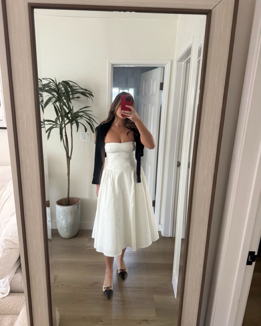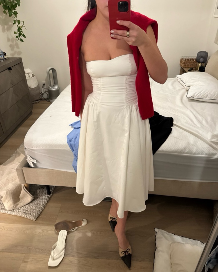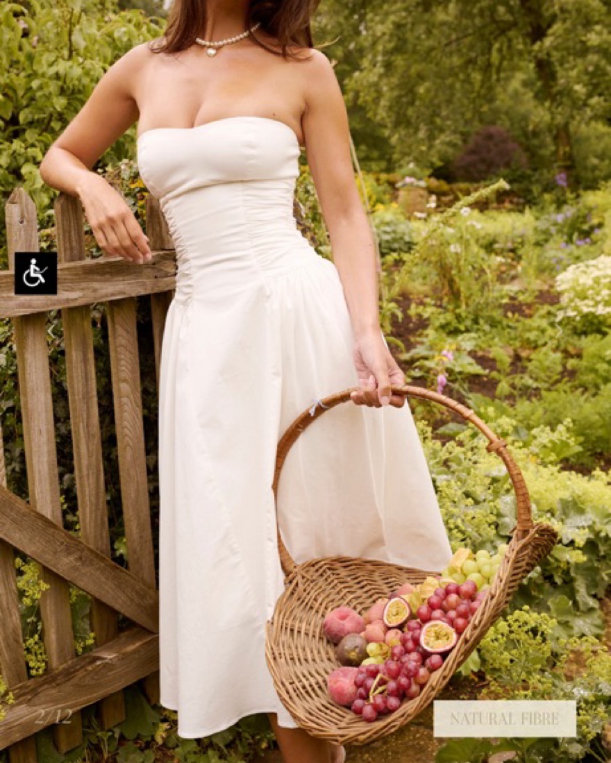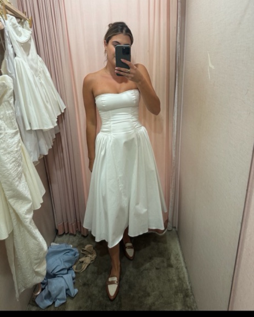 This is a small + cup. The most flattering white drop waist midi dress. It has ruched sides and really sucks you in. I’m a 34d cup size 4/6. I love this dress so much and felt so good in it. Please have it dry cleaned after use