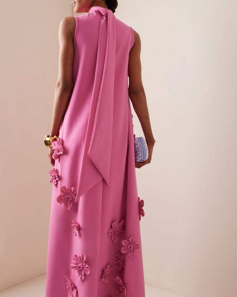 Zoe and Clio maxi gown. Featuring intricate floral embellishments and a sleek sleeveless silhouette, this flowing gown combines modern refinement with romantic detail. Elegant, structured, and ready to elevate every special occasion. High neckline, flowing silhouette, perfect wedding guest dress!