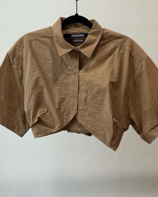 Short sleeve cotton-blend poplin shirt in beige. Spread collar. Button closure at front. Gathering at cropped hem. Tonal mother-of-pearl hardware.