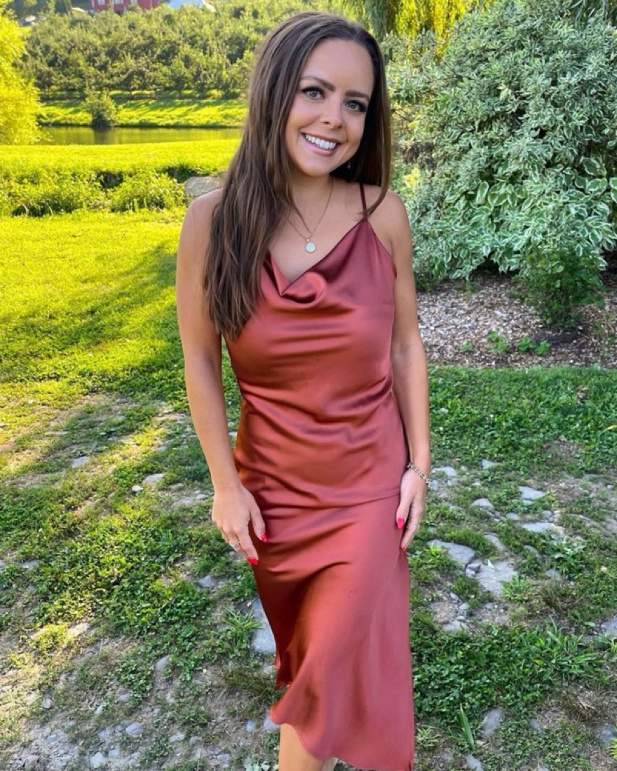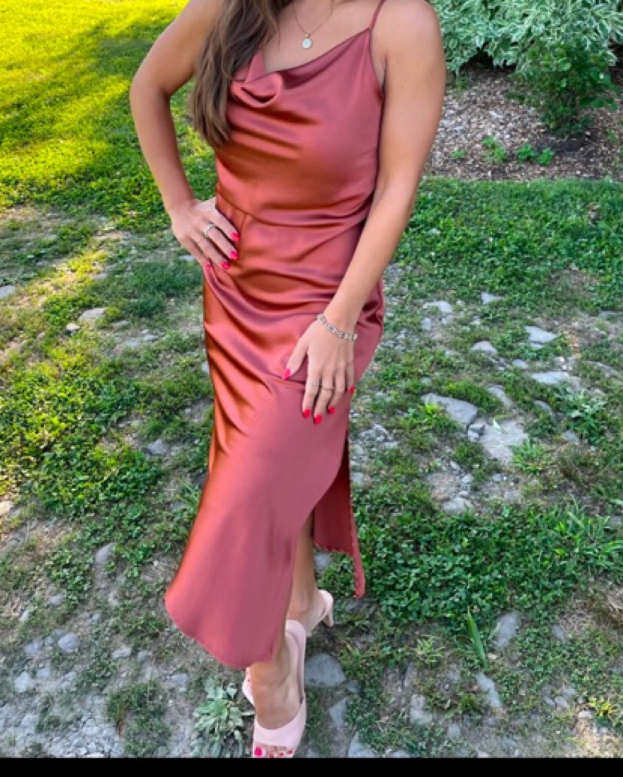 Midi length, left side slit - skims the body and feels very comfortable. I’ve used this for a couple weddings, and the color is very flattering for many skin tones. It’s a size 4, but I usually wear 0 or 2 (XS/small) in other brands