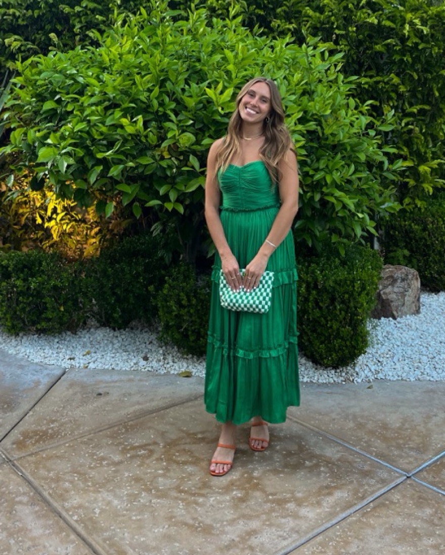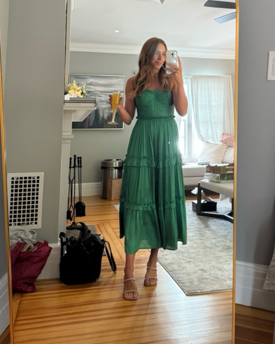 Beautiful green tiered midi dress. Supportive bustier top, adjustable steaps, very flowy and lightweight. vibrant color!! so flattering.