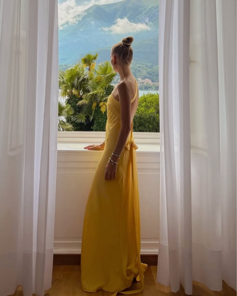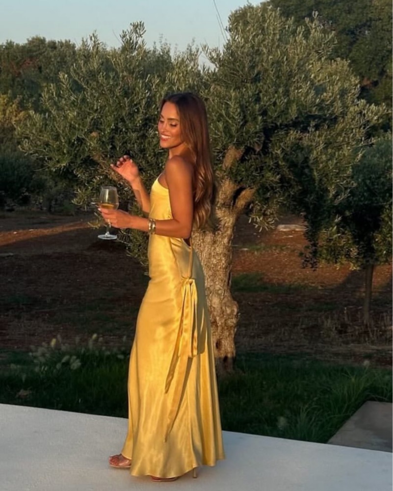 Bottom drags on the floor so please be very careful if wearing heels. Material is also delicate. Price includes dry cleaning fee. Gorgeous backless yellow gown. Has not been hemmed