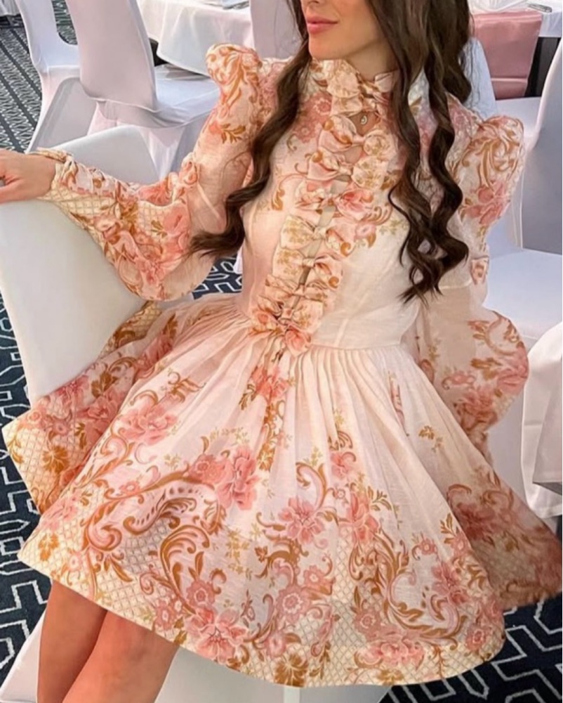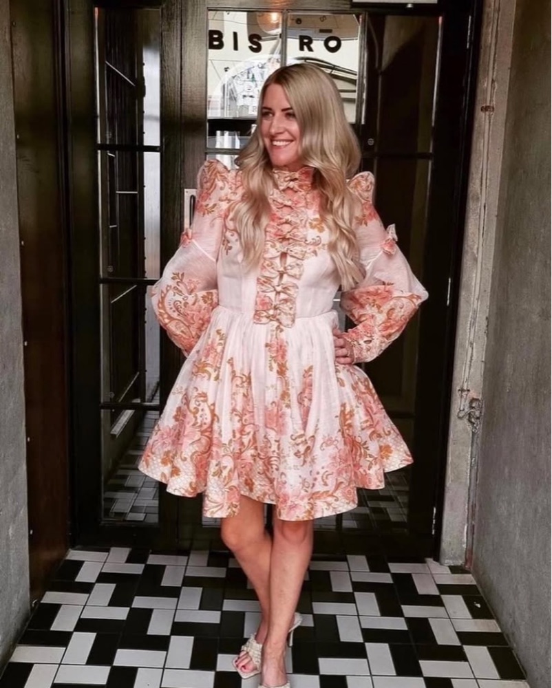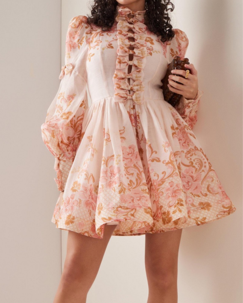 The Postcard Bow Dress in Pink Swirl Floral from Zimmermann’s Resort 2022 Collection. A silk linen organza mini dress featuring a stand collar, puff shoulders and bow details through the sleeves and centre front bodice.