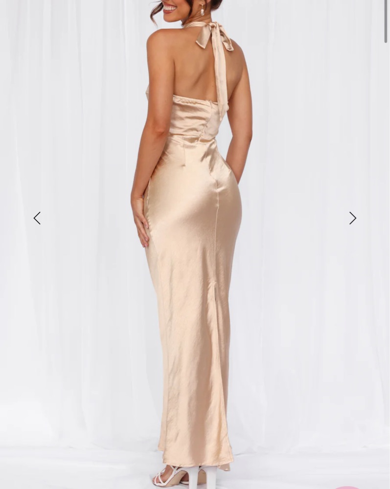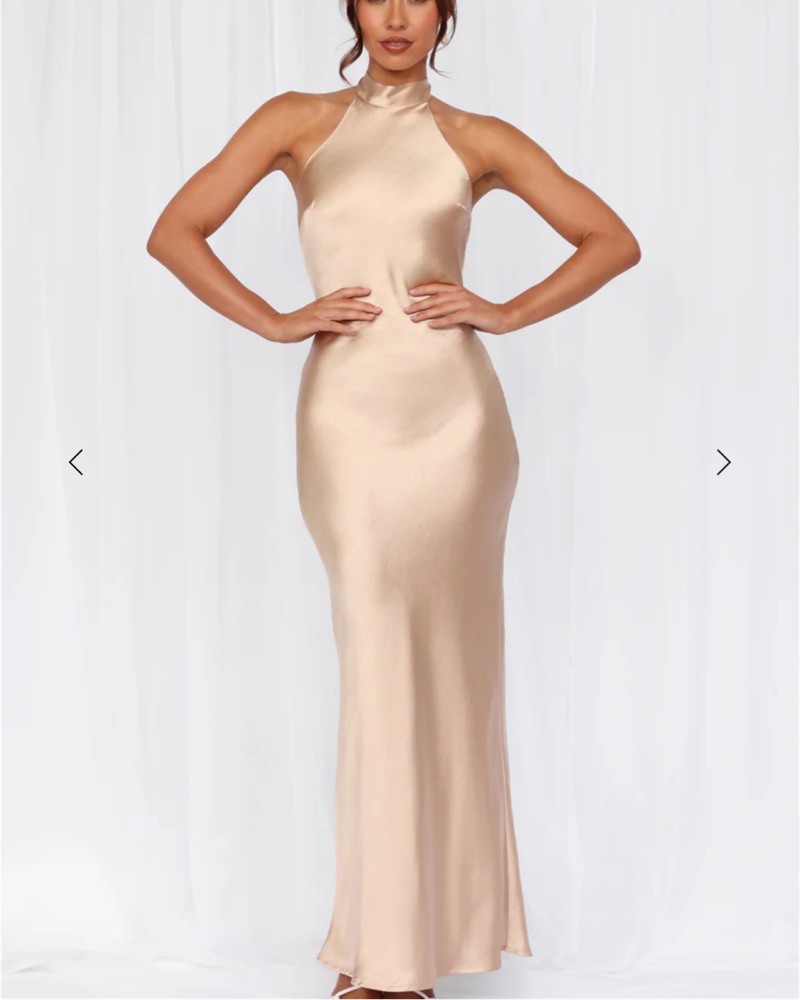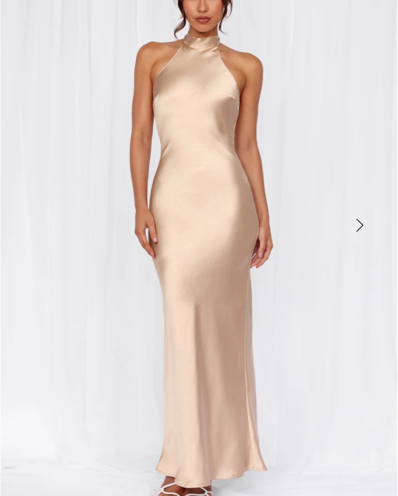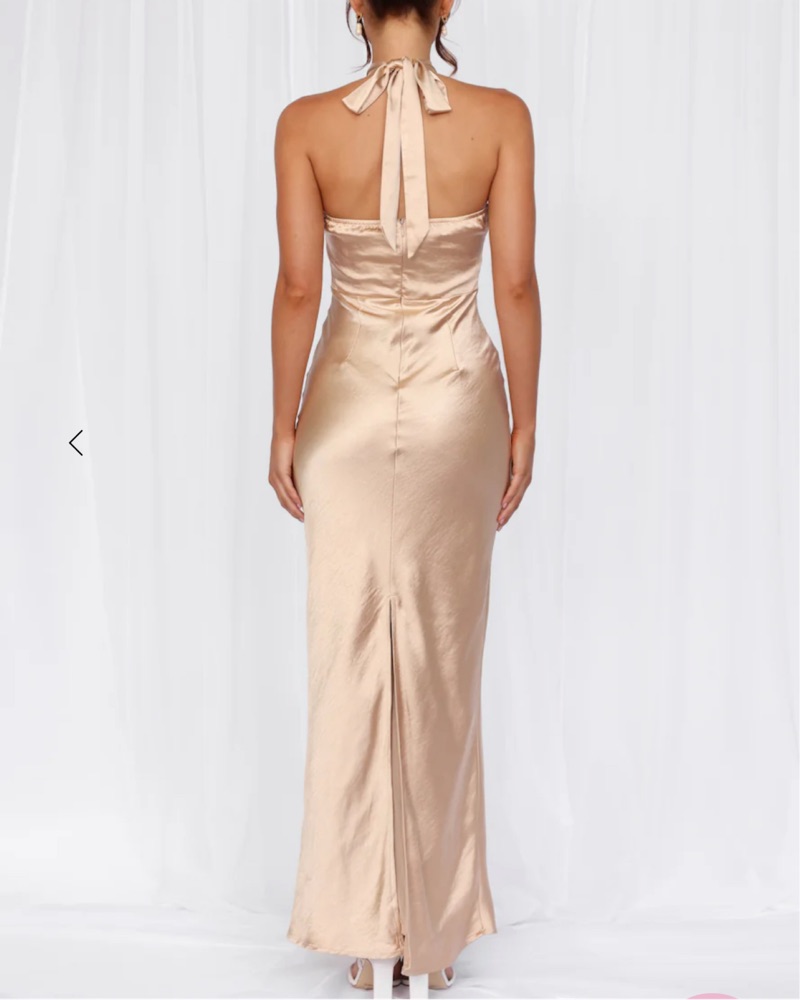 This luxurious satin halter gown is perfect for a formal event or special occasion. The figure-flattering silhouette and sophisticated champagne hue exude elegance.