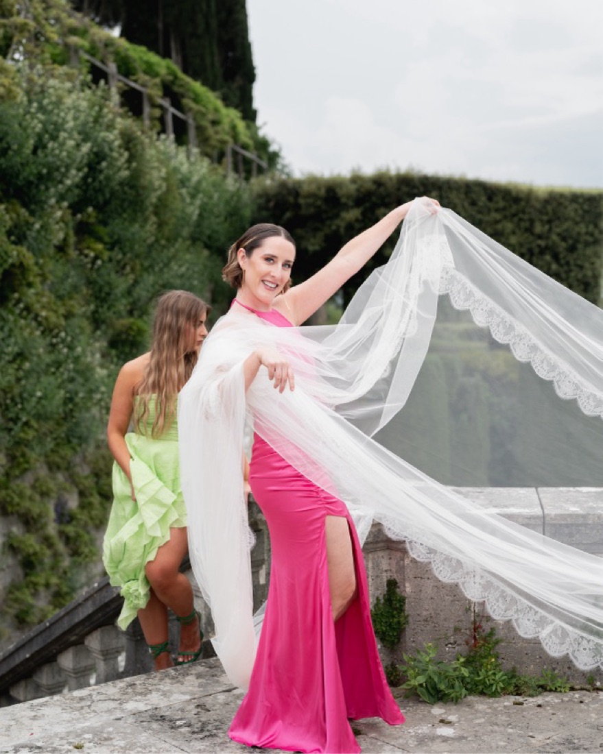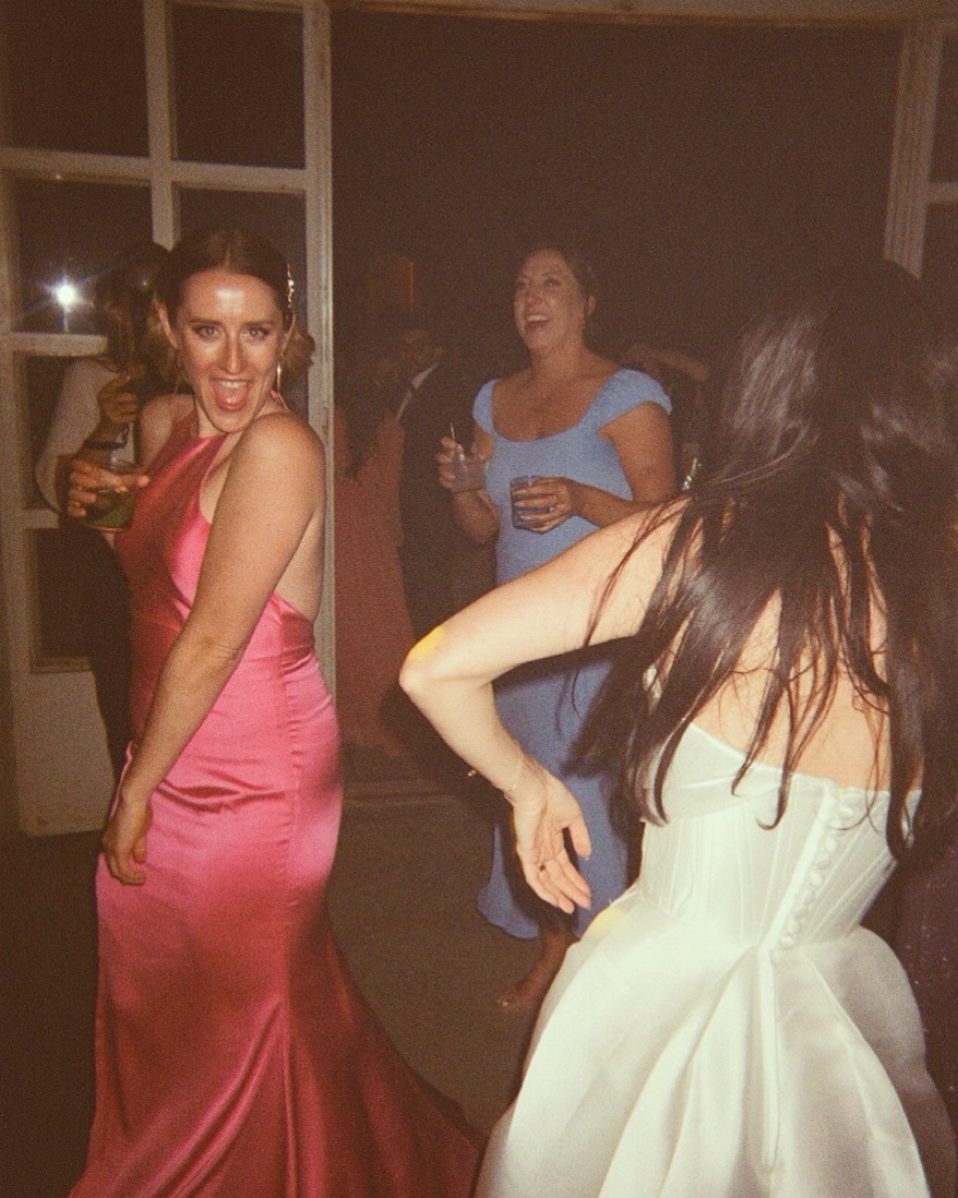 Hot pink high neck low back satin dress