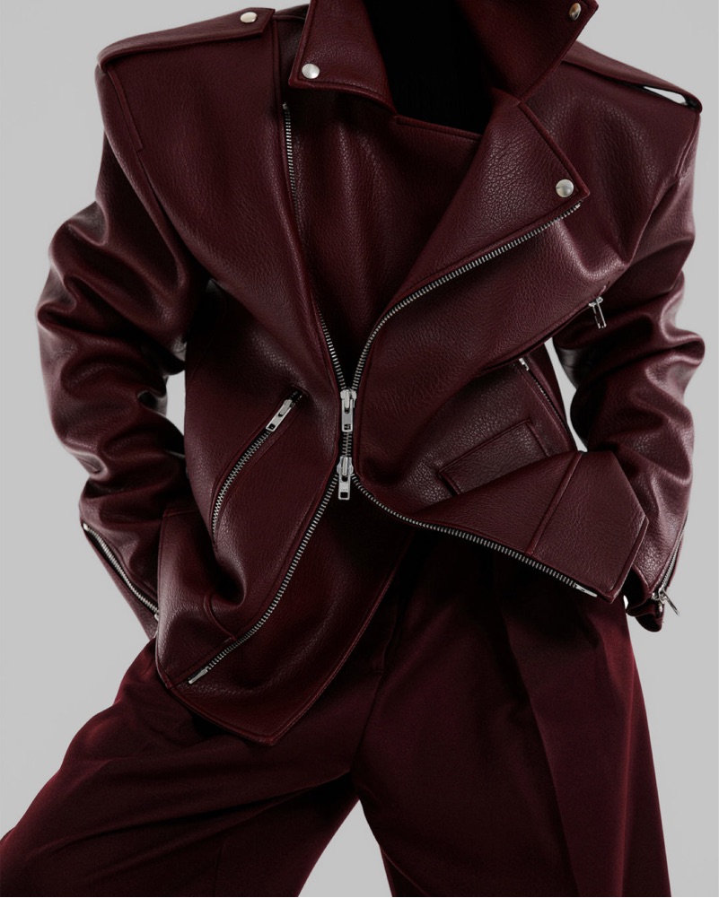 Color: Burgundy Grained faux leather Oversized moto jacket Notch lapels Padded shoulders Three zip pockets