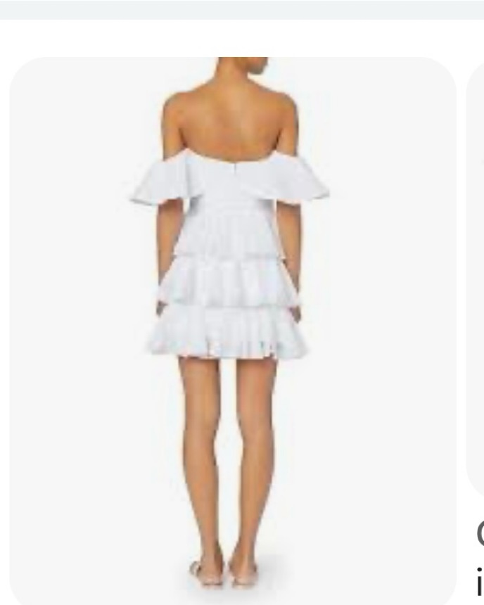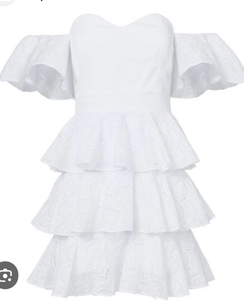 This gorgeous white lace dress features a flattering off-the-shoulder silhouette and cascading ruffled tiers for a feminine, romantic look. Perfect for a summer wedding or special event.