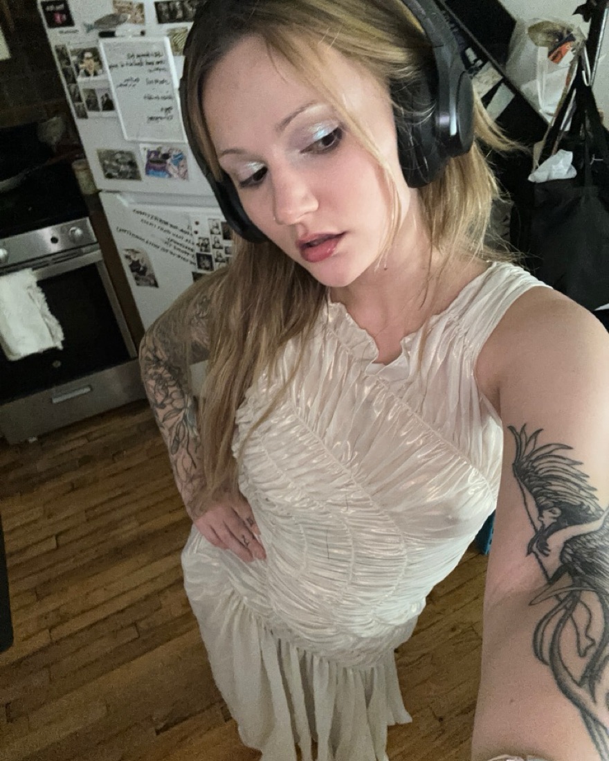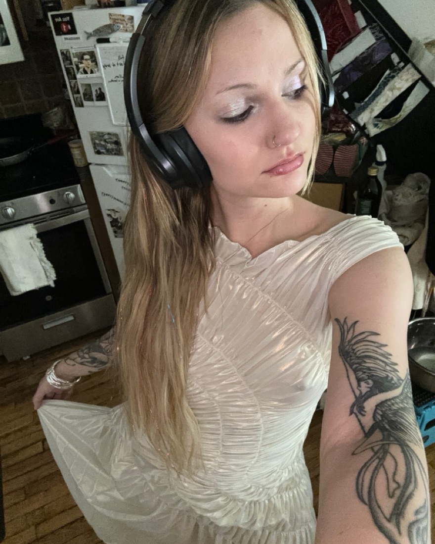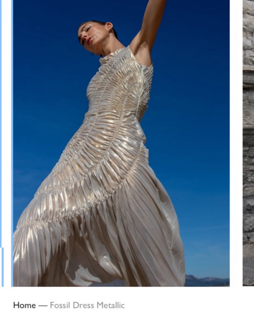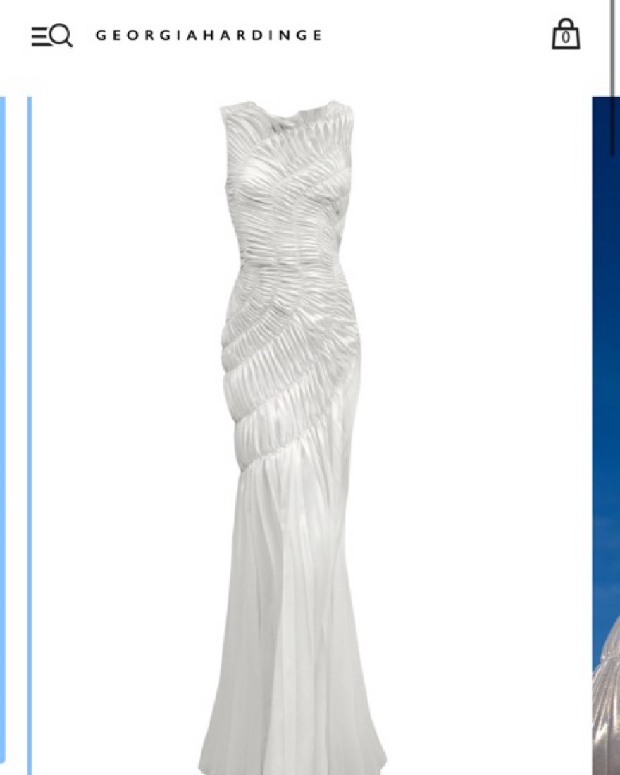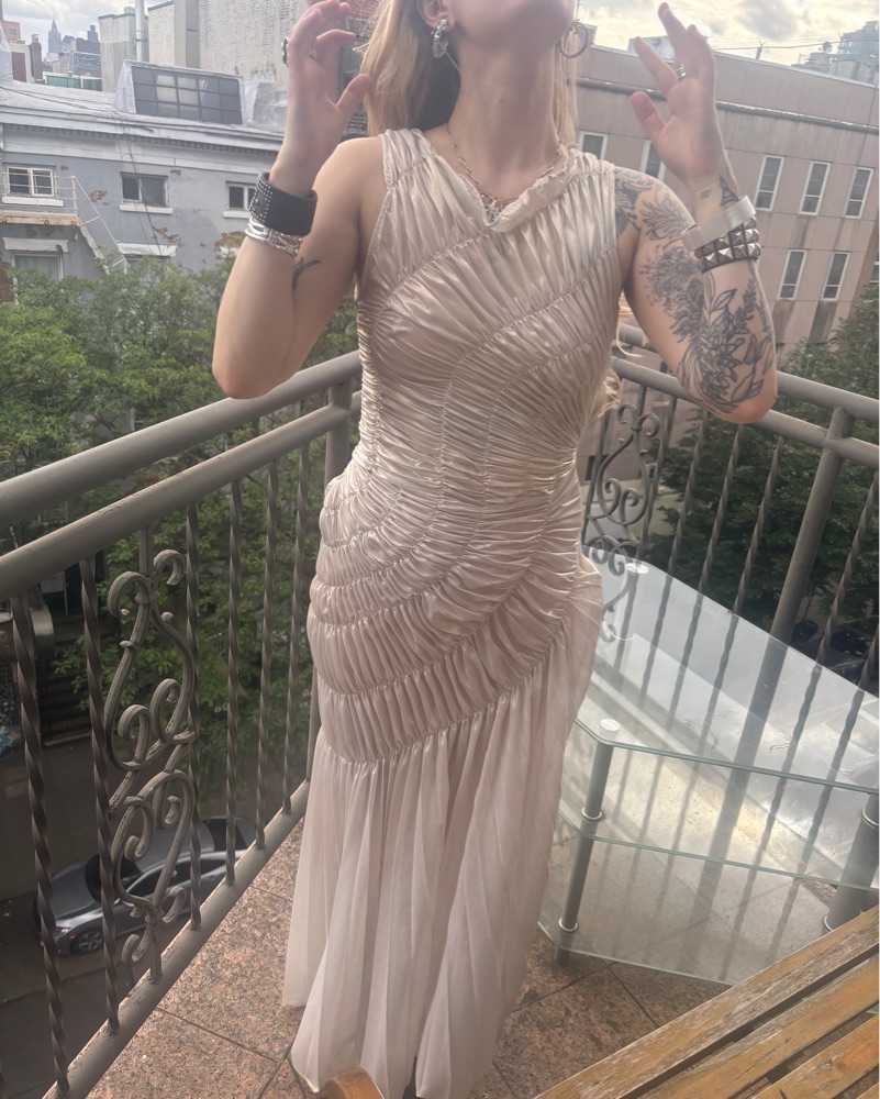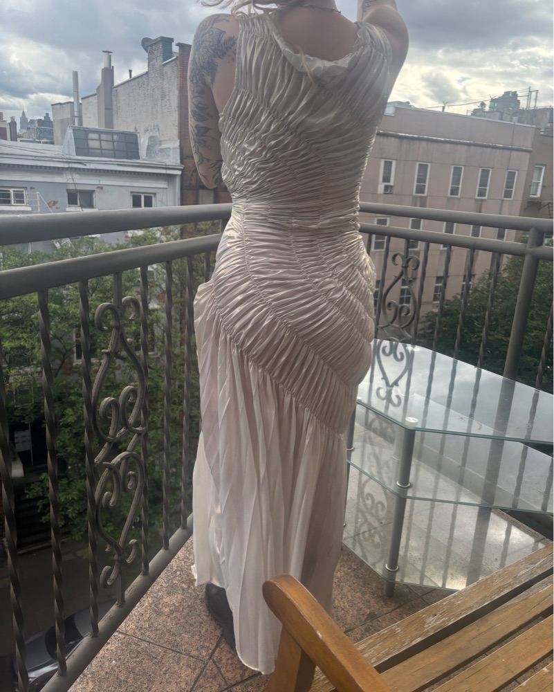 Metallic ivory color georgia hardinge fossil dress. So beautiful, extremely ethereal vibes. Barely worn- hence just selfies/tryon pics. The size is a US 6 / UK 10. I am 5’4” so when i wear it with flat boots it barely touches the ground- would recommend if you are shorter than 5”4 to wear heels!