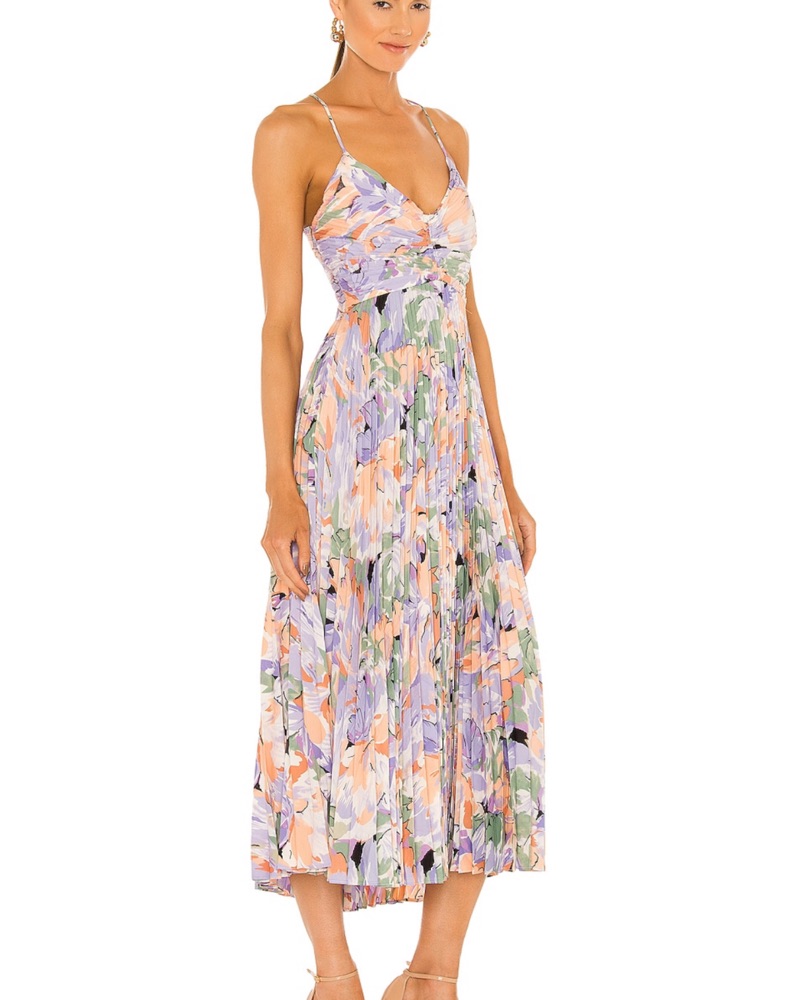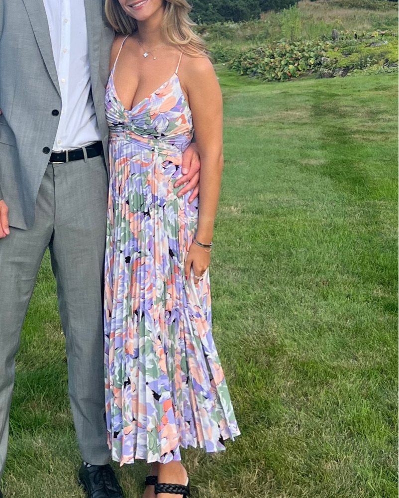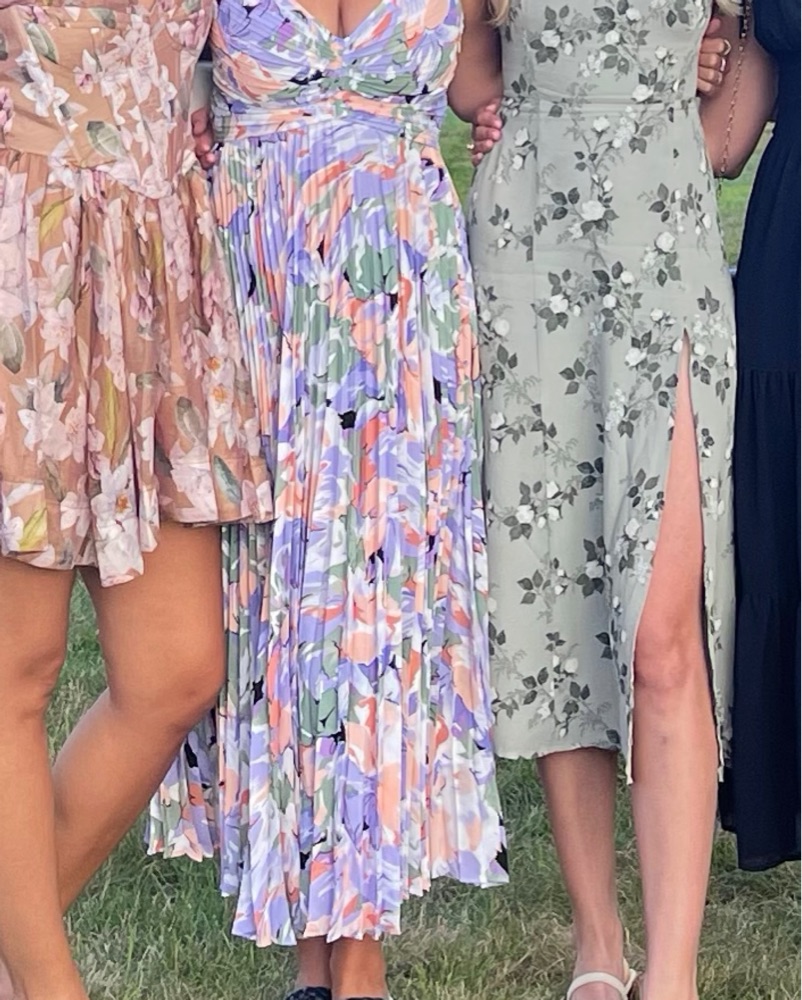 This stunning floral midi dress is perfect for a summer wedding or garden party. The vibrant colors and pleated skirt create a flattering and feminine silhouette.