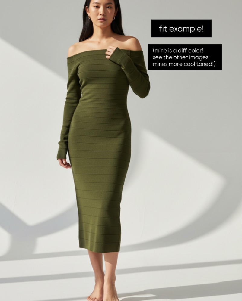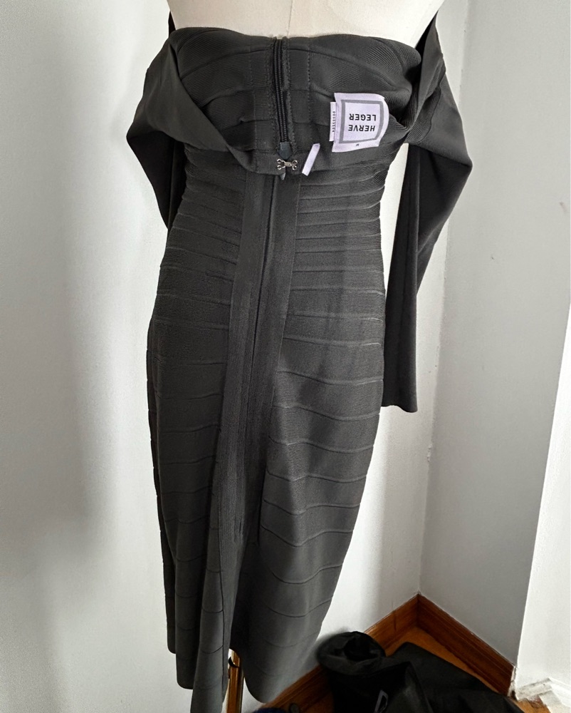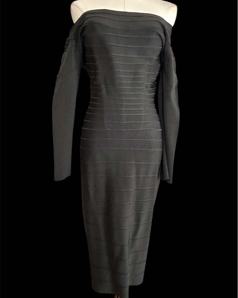 Super flattering, Off the shoulder, long sleeve greenish-gray Vintage Herve Leger Dress. Marked M will fit up to L! 🫶