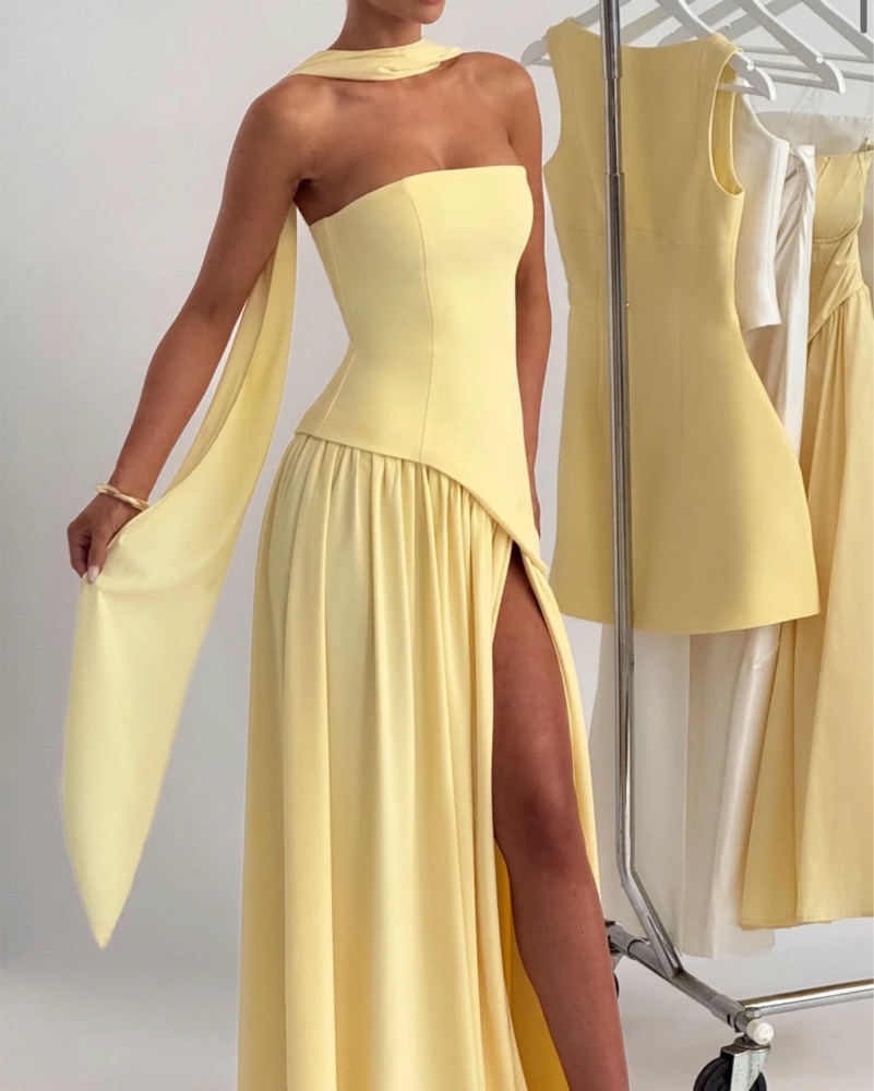 non-stretch crepe bodice with a full, gathered chiffon skirt. Dropped waist design and curved asymmetrical hem with scarf