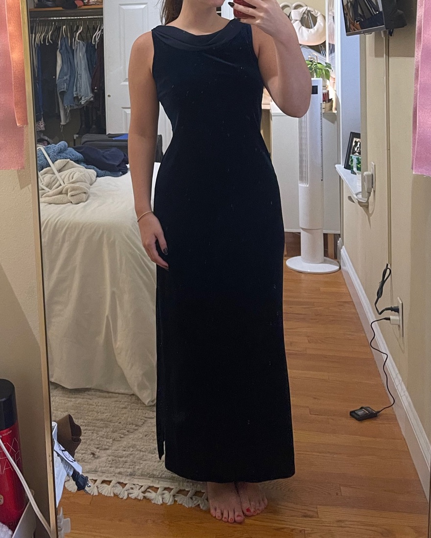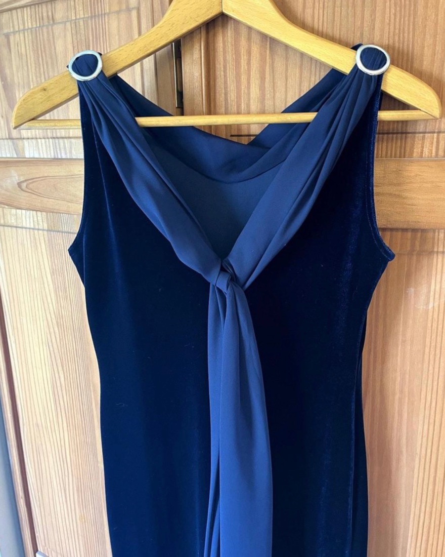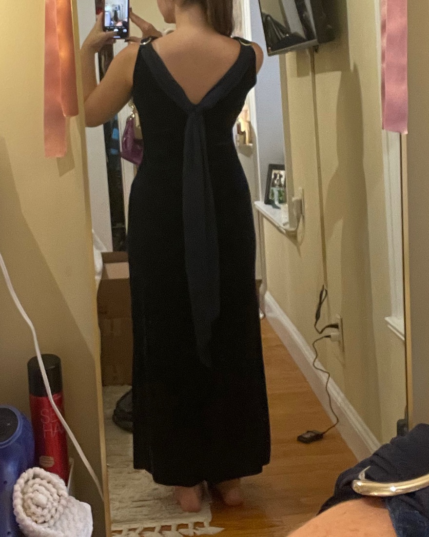 Gorgeous vintage deep navy maxi dress, it has a slit. The back has draping fabric that continues into a front cowl neck and two silver rings on the shoulders. I am 5”7 it hits at my ankles. Brand unknown.