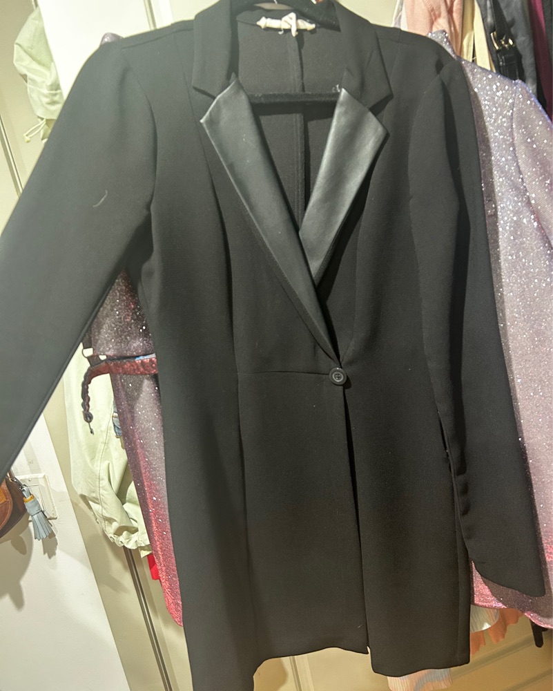 Classic mini blazer dress. Stretch-crepe like material. Form fitting. Low neck. Great for a date night.