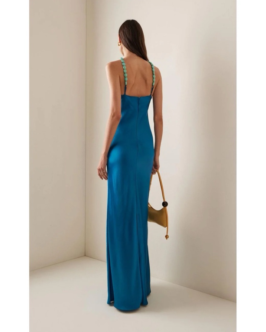 Fabric: mid-weight, non stretch. Beaded halter neckline. Adjustable shoulder straps. Hidden zip in back. Please be careful with dress - the silk is fragile. Dress has scuffs and minor scratches from previous rentals. *Price includes dry cleaning*