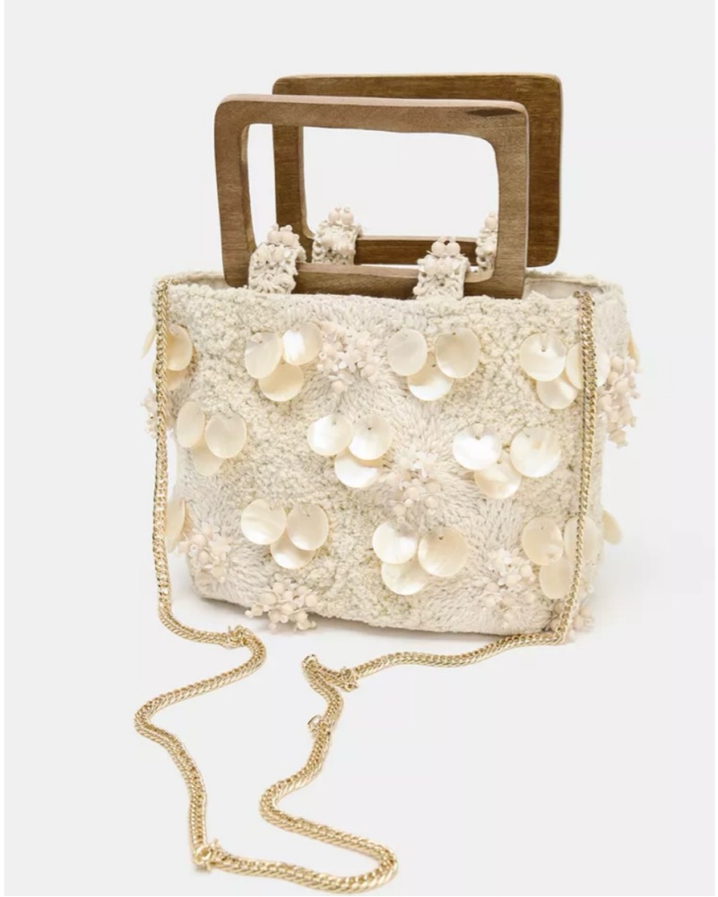 Used once in perfect condition! Perfect for vacation and beach trips. Please be careful with bag as the shell details are delicate and can fall off if not packed/ used gently. Has an adjustable chain strap to wear as crossbody or hand bag