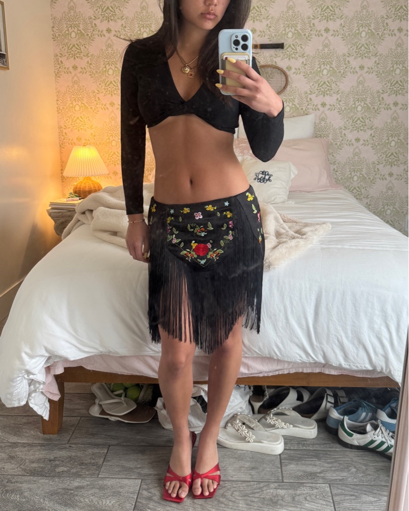 NIIHAI Lara Skirt with floral embroidery and fringe trim 🌹 Mini-Midi length. Hidden back zip closure. Black satin fabric for a slight sheen. Great for a night out, clubbing, festivals, & special events!