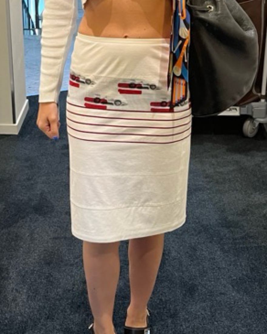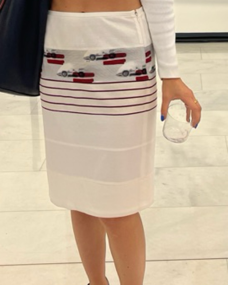 Cotton runway prada printed skirt with formula 1 racecars ! Rare 2010s runway style, I need to renew my vogue subscription to hunt down the collection photo. From a twee era but now perfect for the popularity of f1 in the US, italian size 40 ir US 4. It says prada in print and has a triangle logo