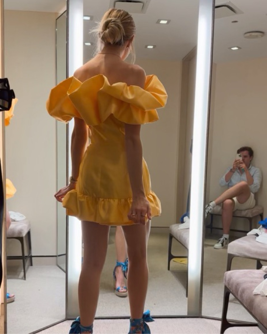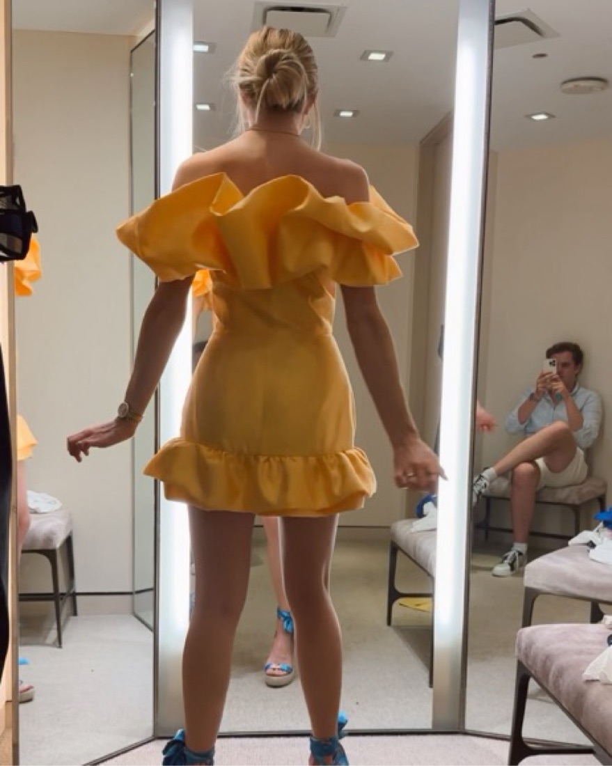 She is so gorgeous. Extremely flaggeding on the waist amd the perfect length! Markarian "Grace" dress with dupioni ruffle trim Off-the-shoulder neckline Sleeveless A-line silhouette. Wedding guest dress