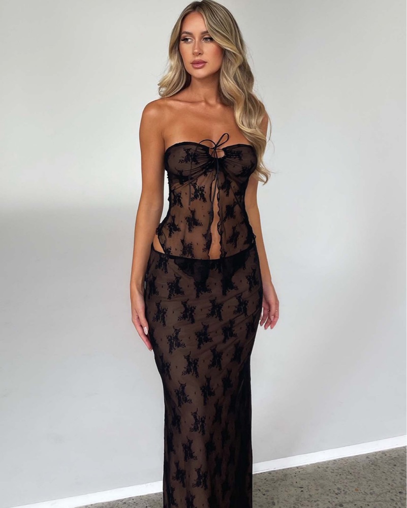 This stunning black lace two piece set, the skirt is lined perfect for a vacation, maternity, night out. Please note the top is a M the bottoms are a S