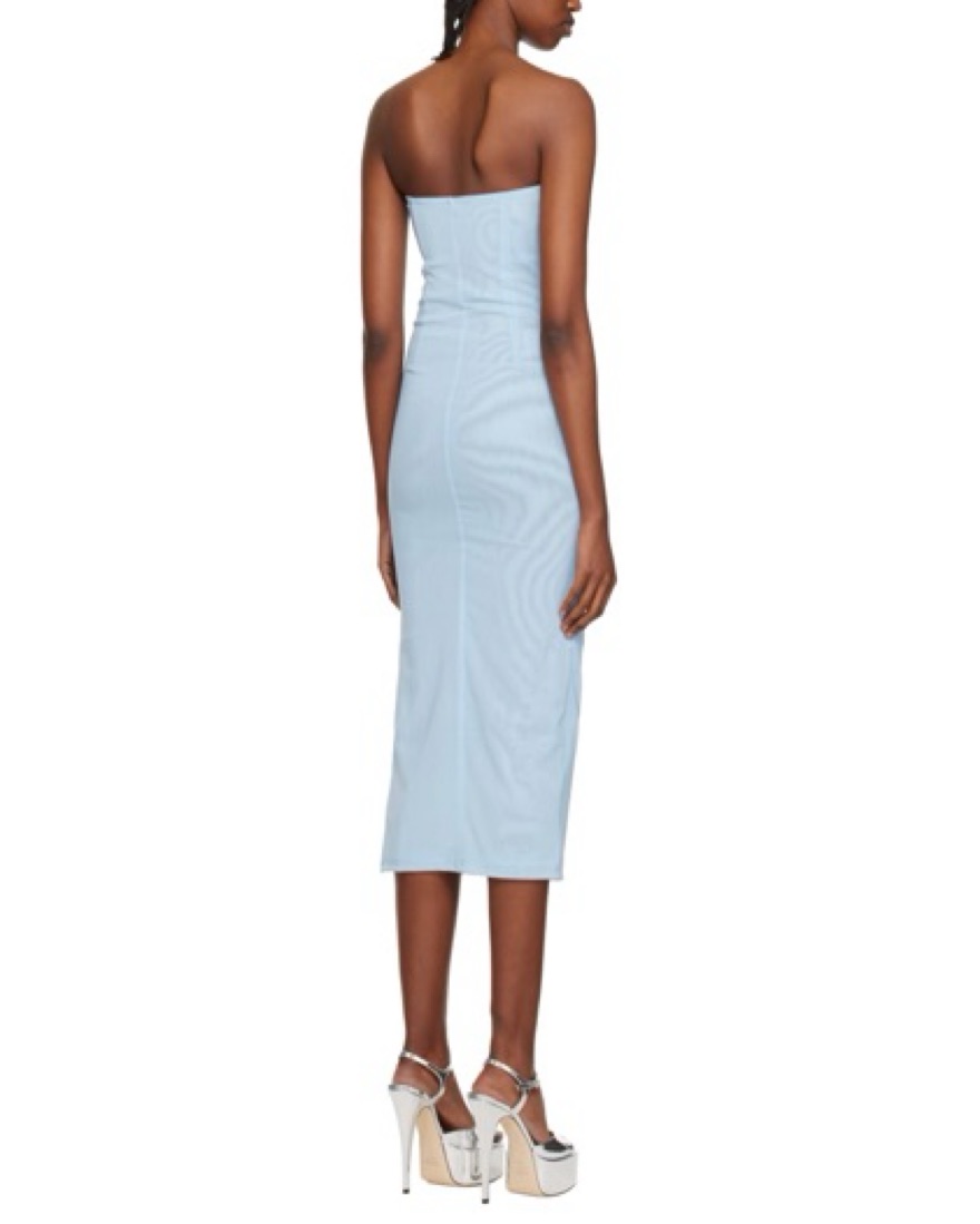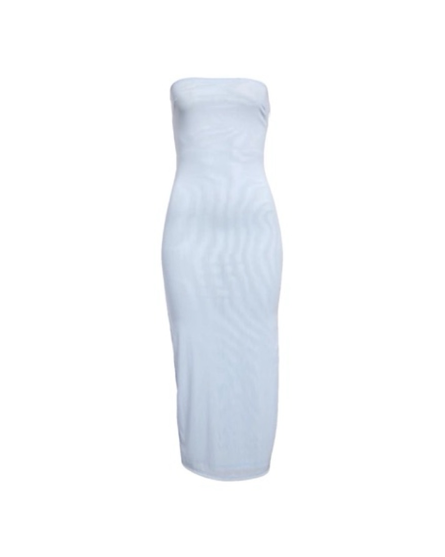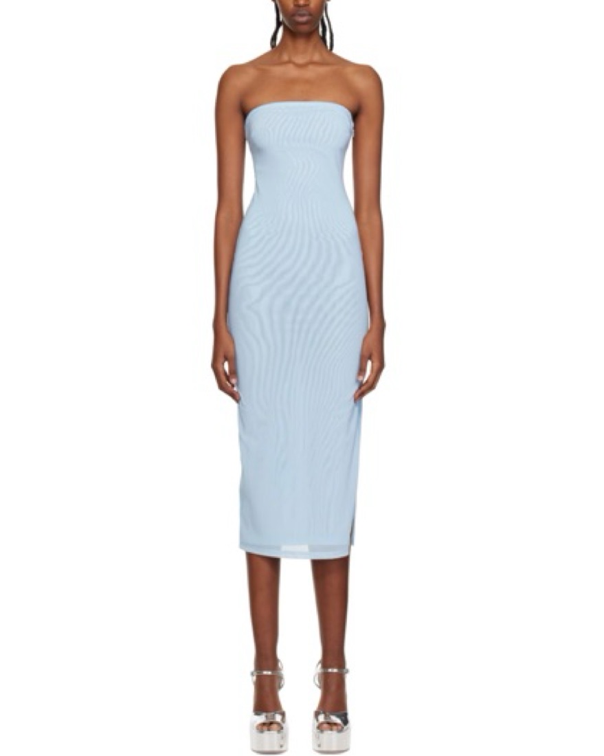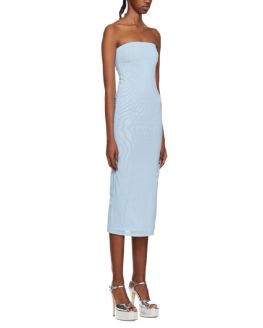 Stretch nylon mesh dress. • Straight neck • Slit at side seam • Concealed zip closure at back • Full mesh lining Supplier color: Baby blue