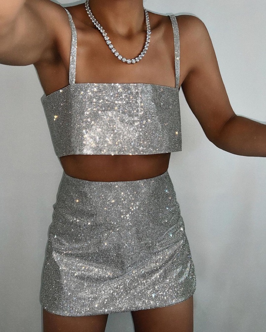 Size XS/S. Delicate material, please be gentle and store/pack flat to prevent creases! Set includes both top and skirt. Featuring a relaxed fit, crystal rhinestone lined fabric, mini length and silver zip closure at the back. Complete this stunning set with the Breathtaking Crop and strappy heels.