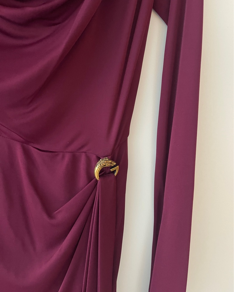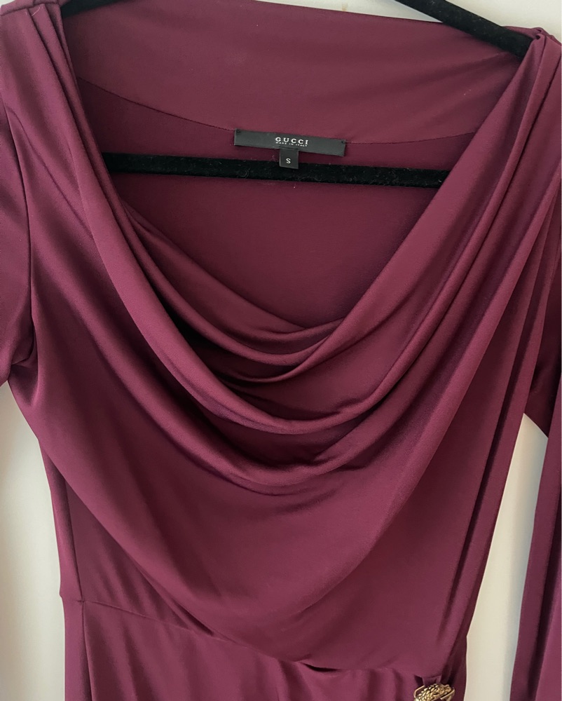 This stunning Gucci dress features a luxurious burgundy hue and a draped, figure-flattering silhouette. Perfect for a formal event or special occasion.