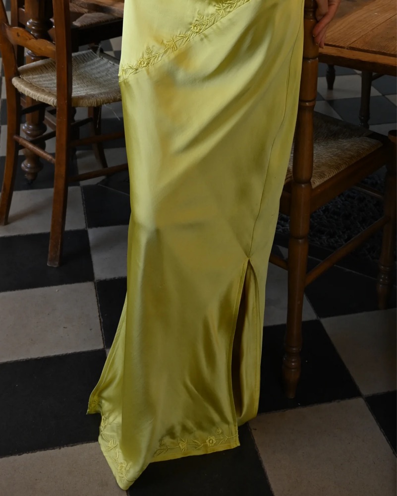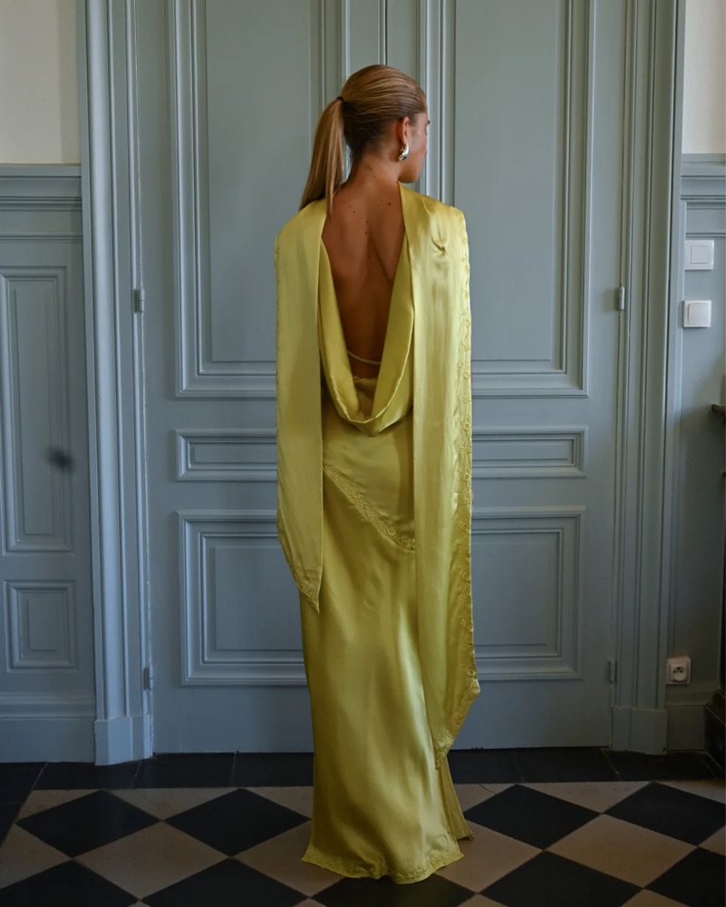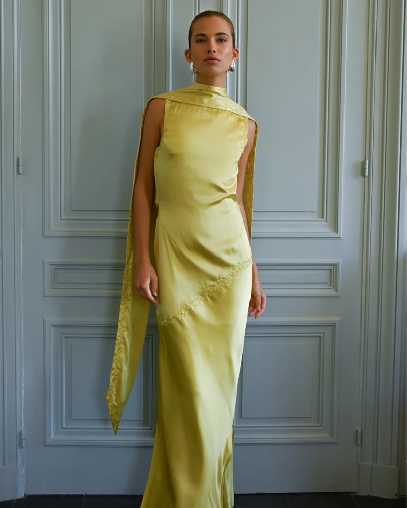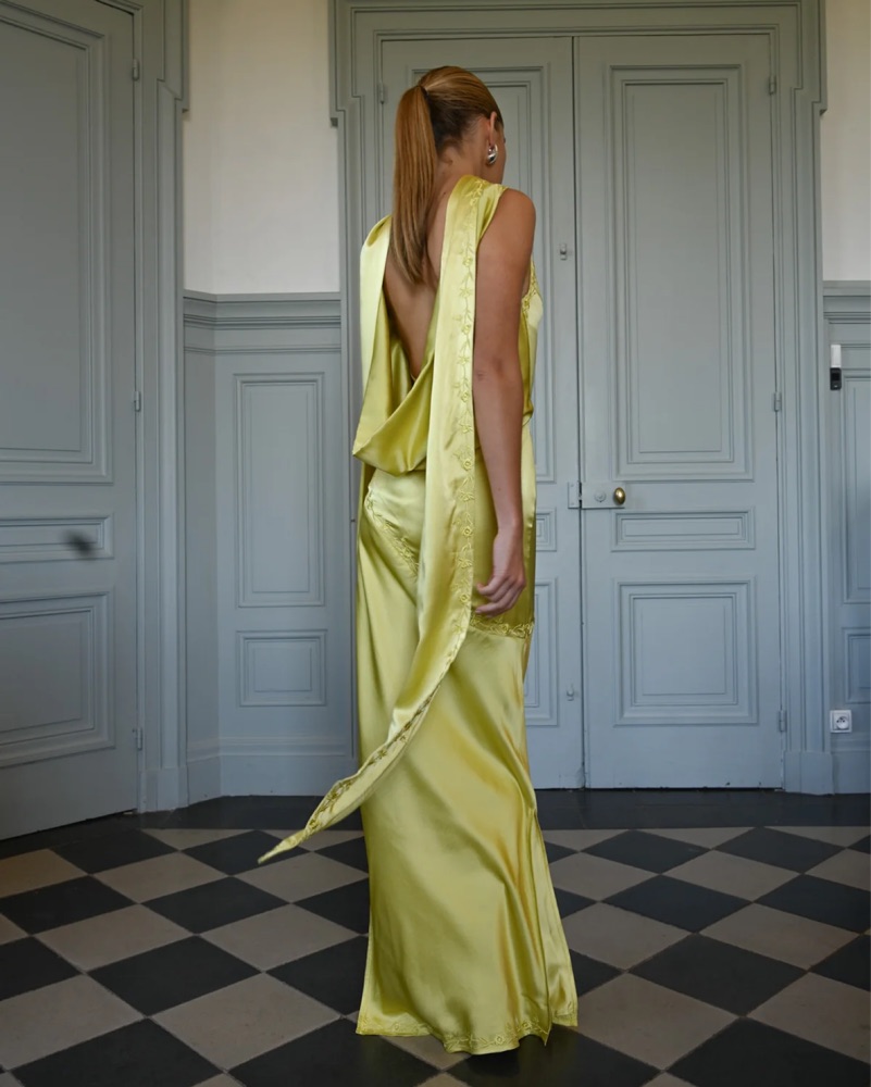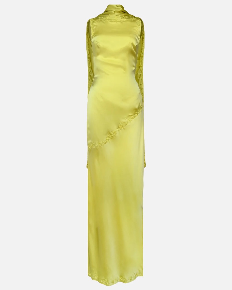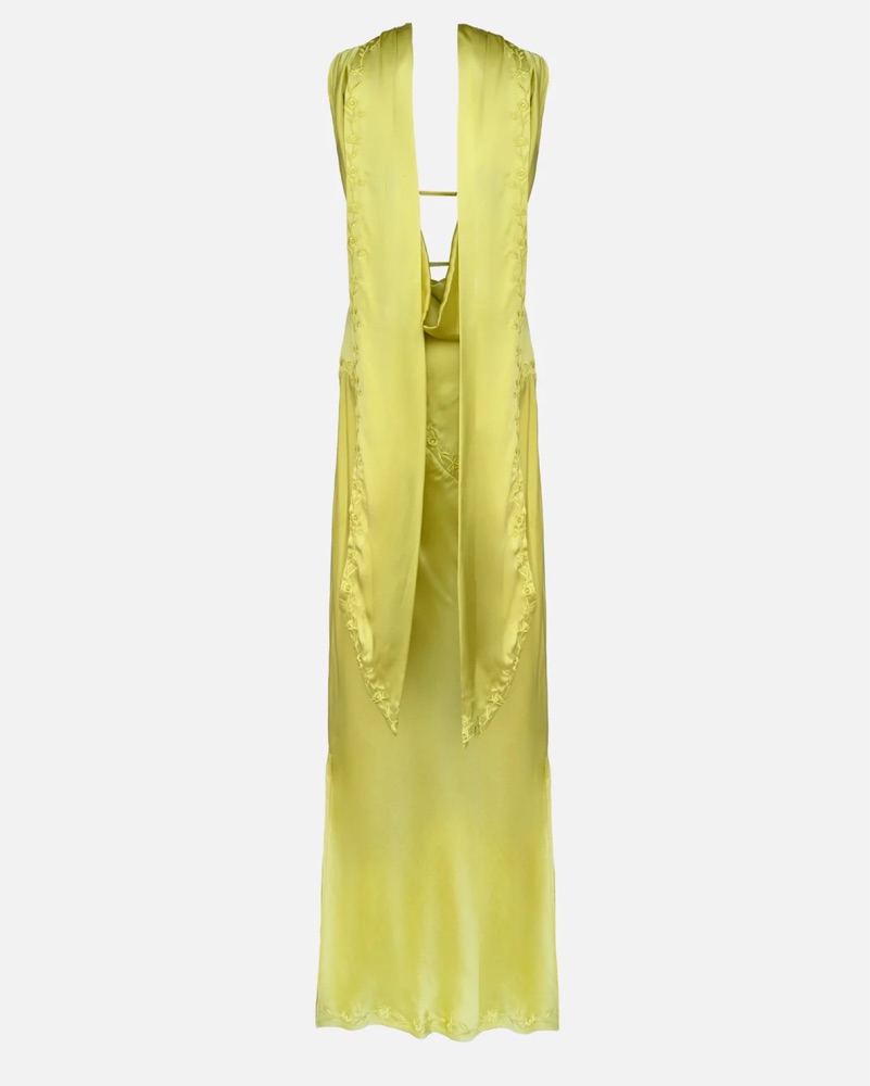 Unworn silk maxi dress from Yellow The Label in chartreuse. Features a high neckline, draped open back, and a detachable embroidered scarf that can be styled multiple ways. 100% silk with a fluid silhouette!! Perfect for a black tie event, wedding guest, formal, or evening occasion.