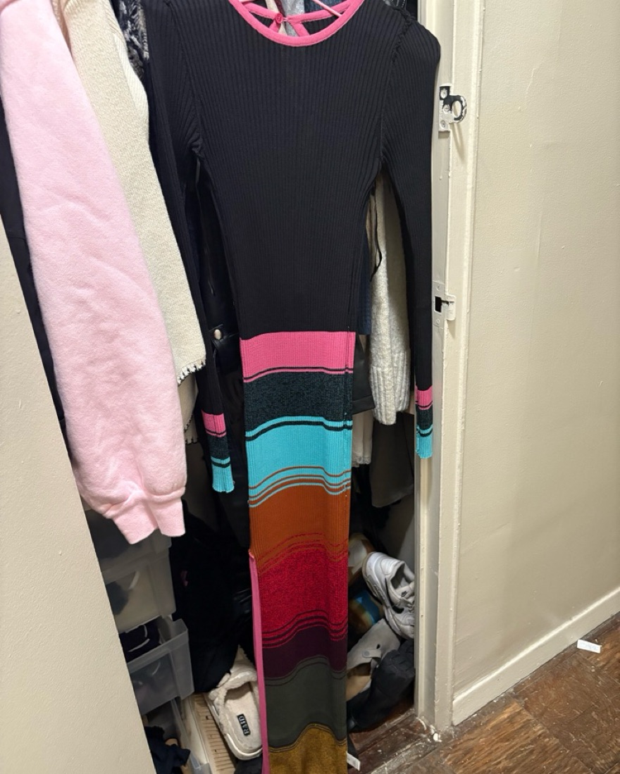 This eye-catching maxi dress is perfect for a fun night out. The bold color blocks and form-fitting silhouette create a stylish and confident look.