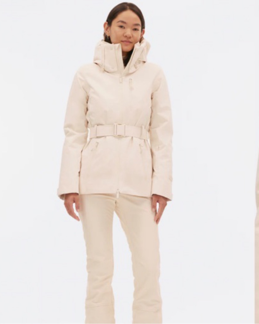 ultra-chic and performance-driven belted ski jacket, designed with a full day on the mountain in mind