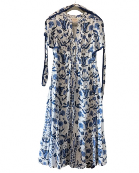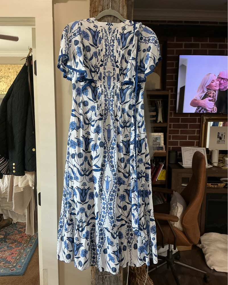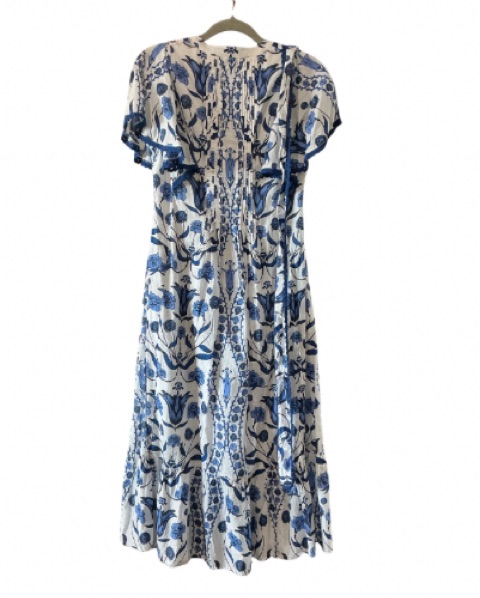 This beautiful blue and white floral midi dress is perfect for any special occasion. The intricate floral pattern and flowing silhouette create a lovely, feminine look. Has buttons down front & tie for waist