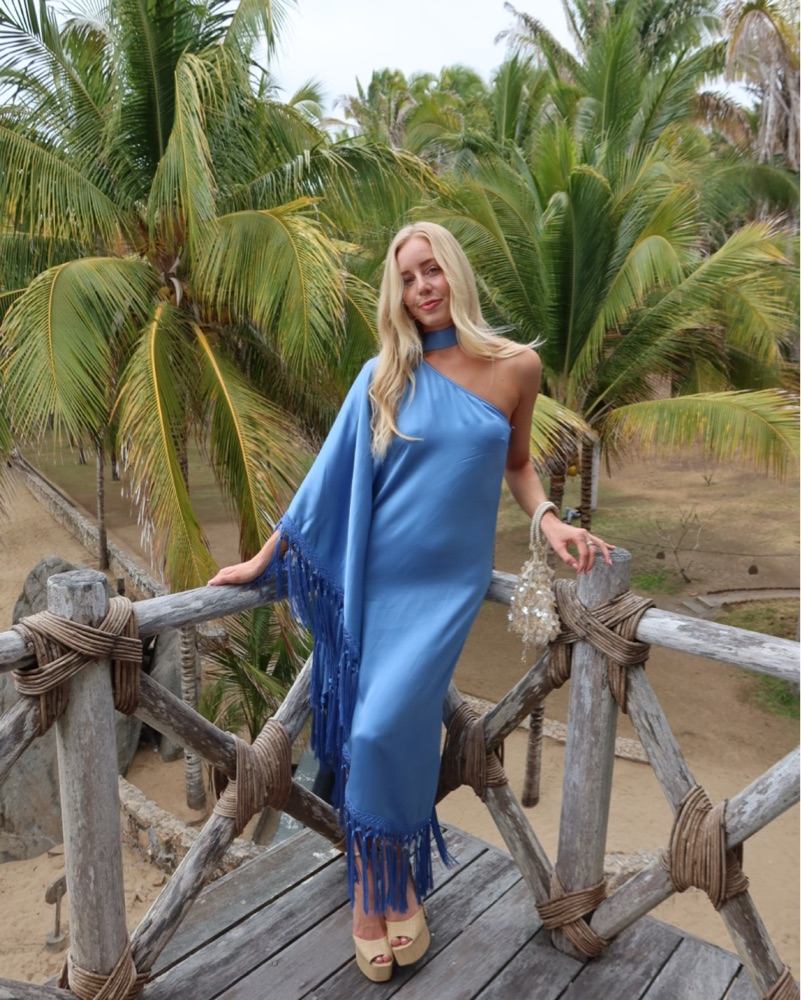 This captivating one-shoulder maxi dress is perfect for a tropical getaway or an evening of oceanside festivities. The flowing, fringed silhouette creates an effortless, bohemian-inspired look.