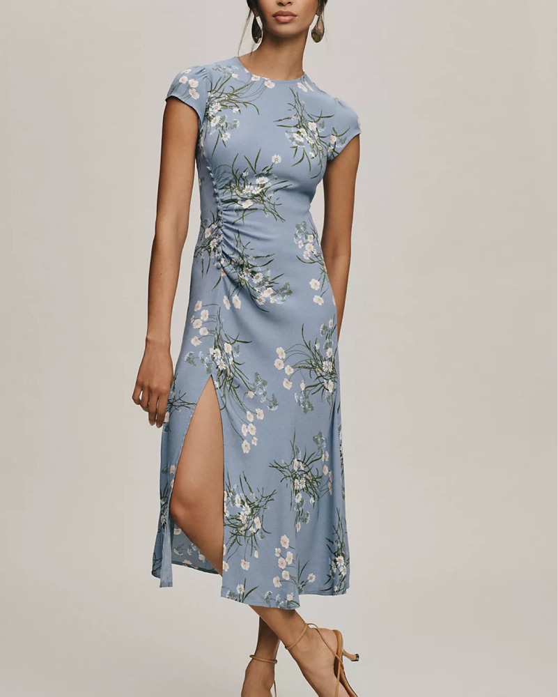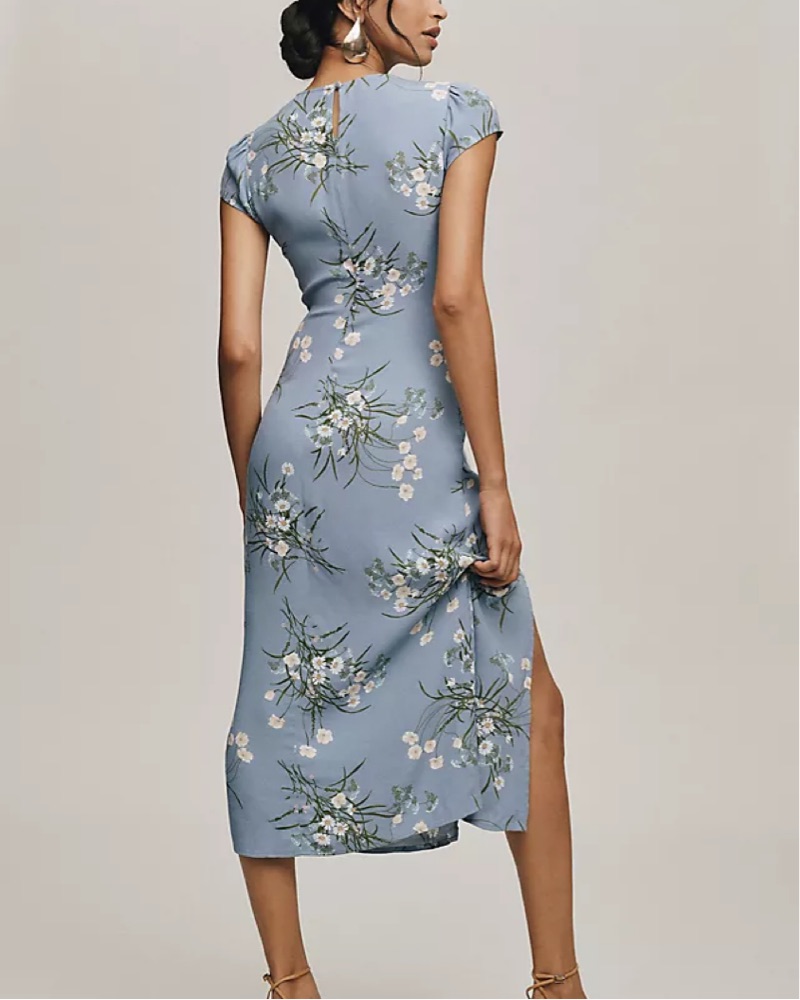 - Back zipper, high slit, and button details