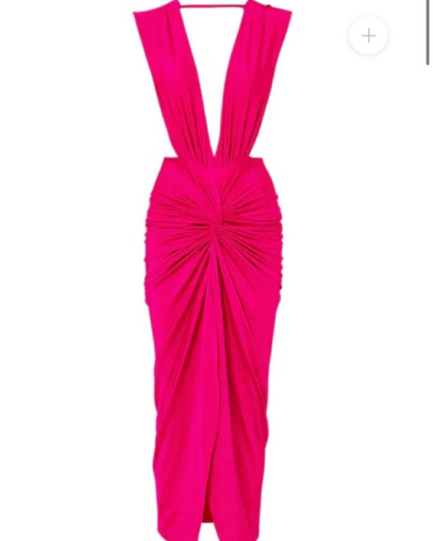 This knot-front midi dress features a plunging V-neck and open back. Super stretchy material that snatches you in.