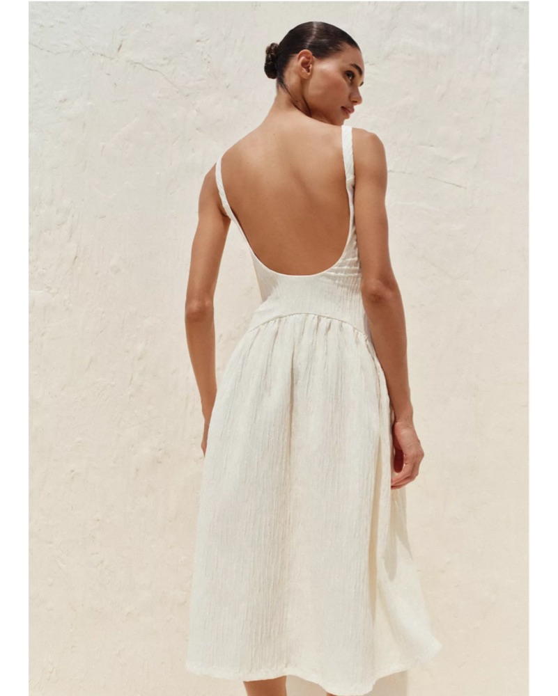 Off white dress with texture and trending waist lines. Straps were shortened about an inch. Sl flattering! Wore to my bridal shower