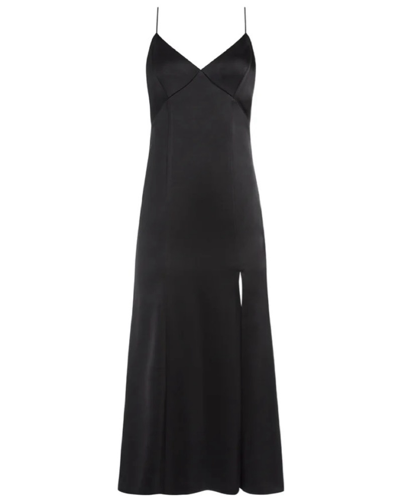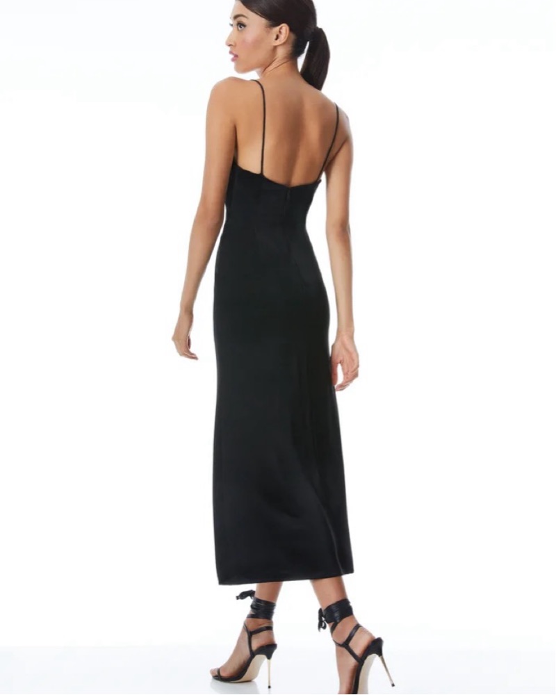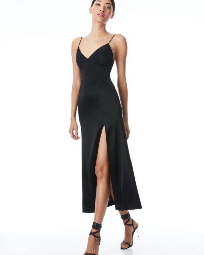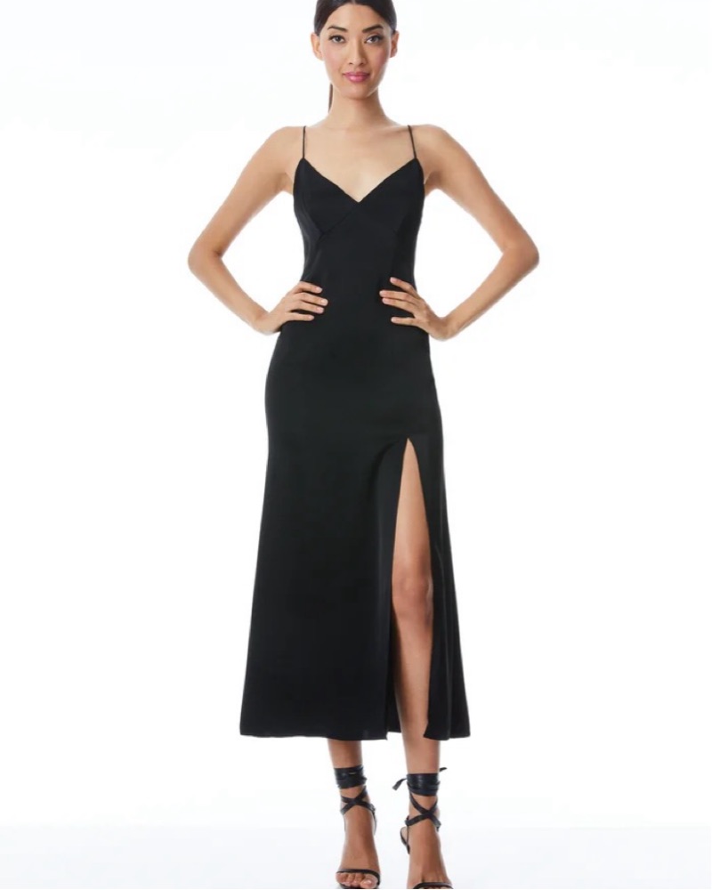 Perfect black slip dress for any occasion! Super soft fabric that is thick enough to not show any imperfections underneath. High slit. Will wear more as a gown in shorter people.