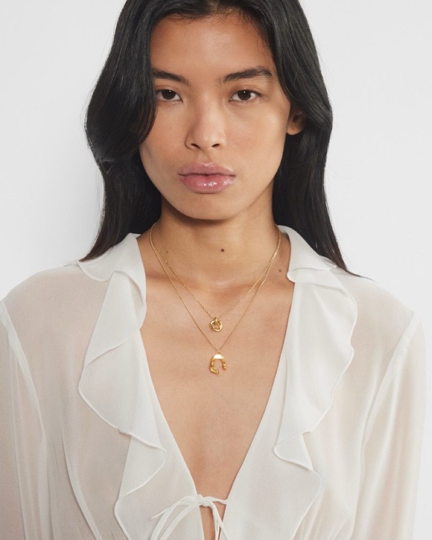 Size small! From website: This is a V-neck blouse with ruffled edges and a tie closure. It’s made with Fête Chiffon™ — lightweight, semi-sheer fabric with an ethereal drape. This version is made from 100% recycled polyester.