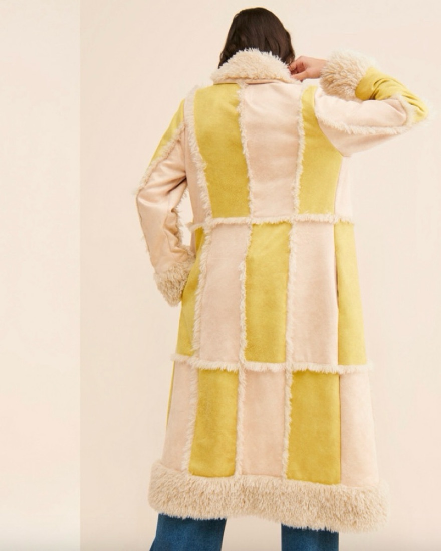 Light yellow overcoat, plush faux fur trim inside, side pockets, hidden front closure SIZE L so cozy and warm!