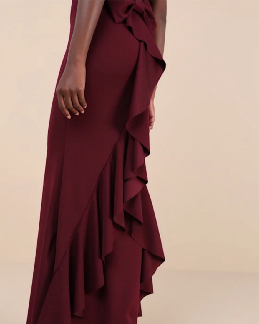 Backless Bow Ruffled Maxi Dress. Comfortable and flattering stretchy crepe knit dress that features a sophisticated boat-style neck and open back design. Perfect for the holidays!