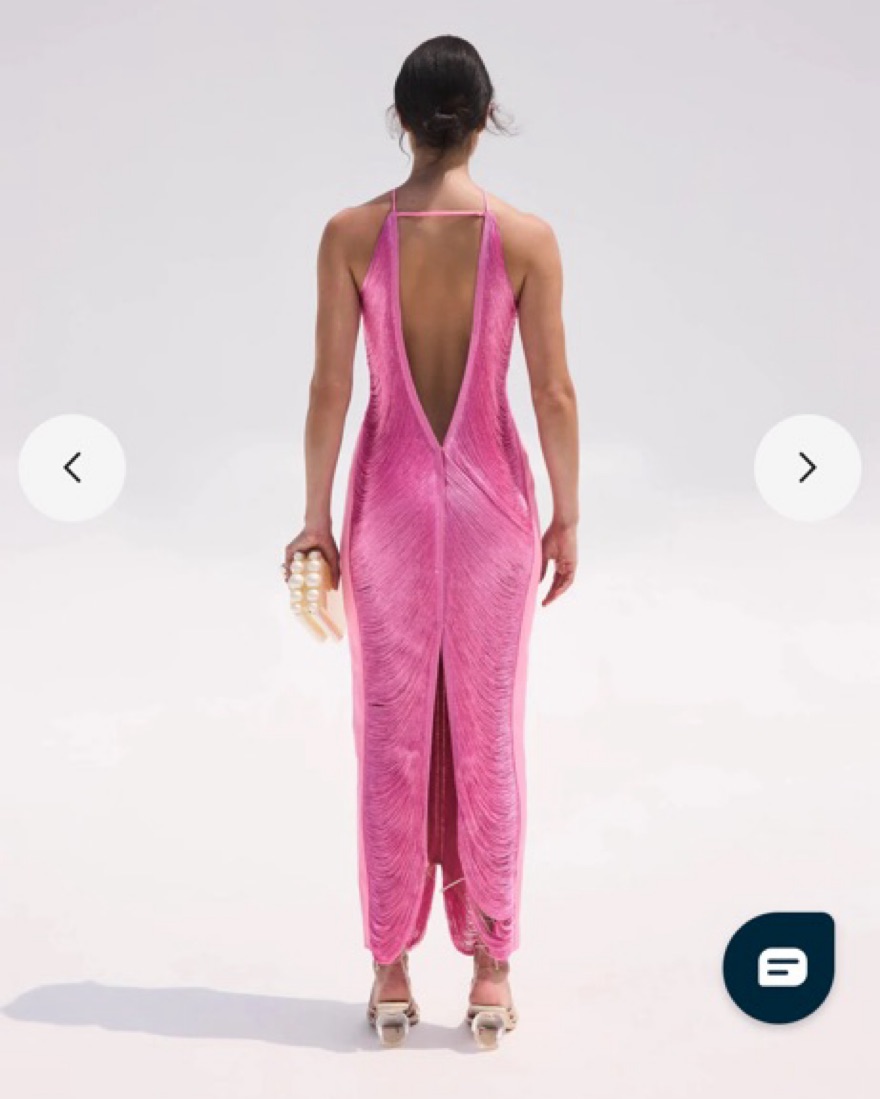 The Renata is a seductive halter gown. The layered and draped fringe skims the body creating luscious movement. The open back is a deep v-cut connected at the shoulders and echoed by a slit in the back of the skirt. Wear the Renata and plans and eyes will follow. TREAT WITH CARE!!!