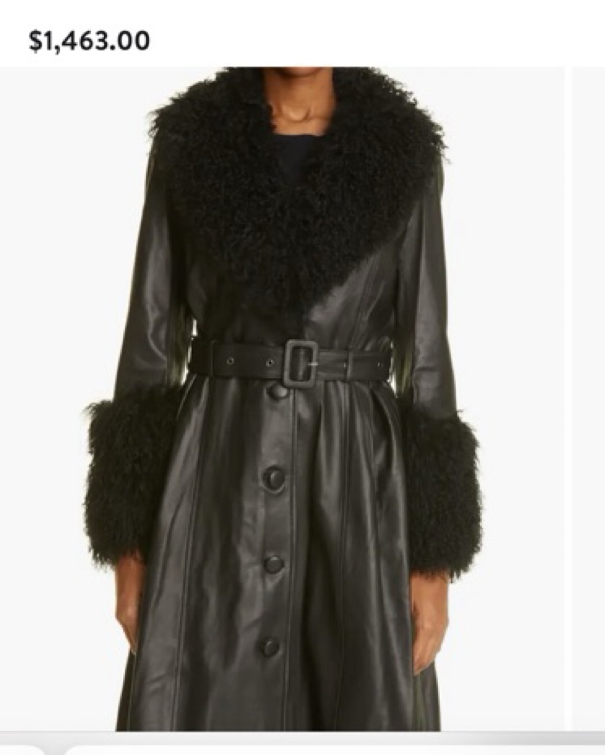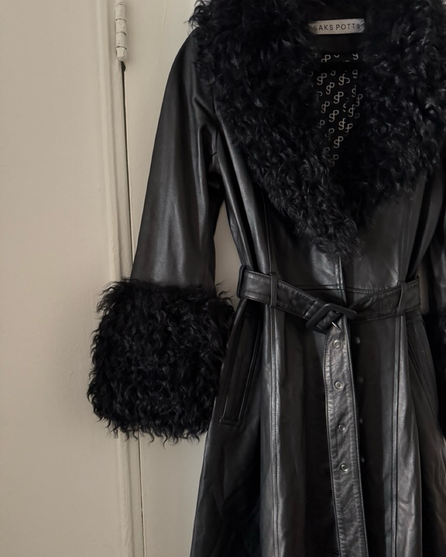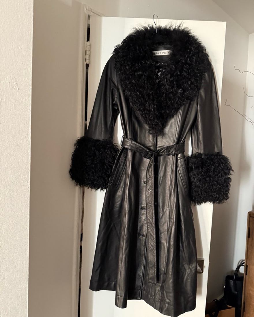 This stunning black leather and faux fur coat is a must-have for any fashionista's wardrobe. Pair it with your favorite jeans and heels for a chic, city-girl look.