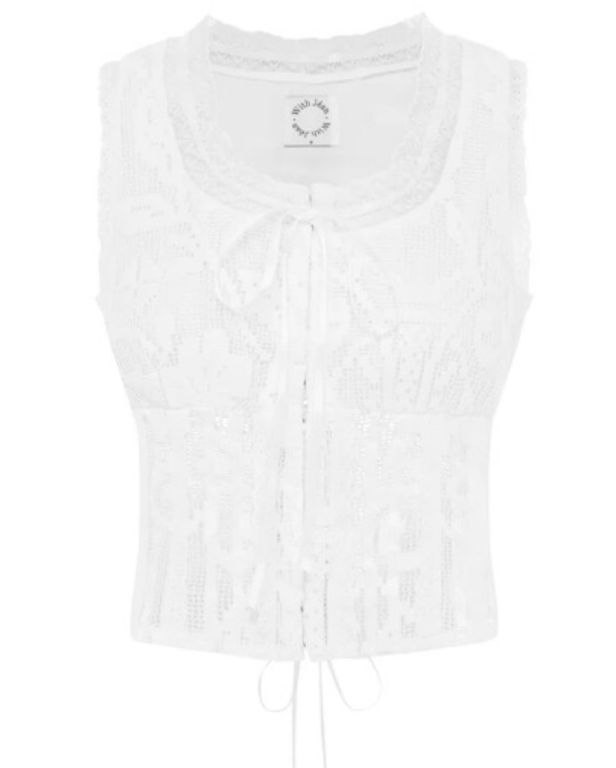 White top, can unclasp in the front and tie tighter in the back. Looks awesome undone a little in the front and closed like the picture