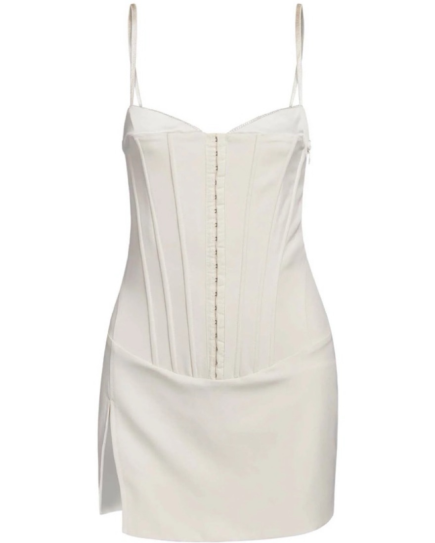 Sold out. Stretch woven mini dress featuring contrast satin bust cups detail. Corset style body with bodycon fit - Boning with hook and eye detail along the centre front of dress. Fully lined. Had tailored so that it fits XS/S.