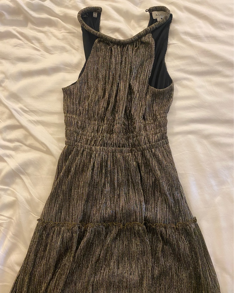 ALC Elara Dress Metallic Gold Tiered Midi dress. Size 8 but would say it could work for a 4/6. Has a lot of stretch and super comfortable. High neck halter dress, fully lined. Black and gold