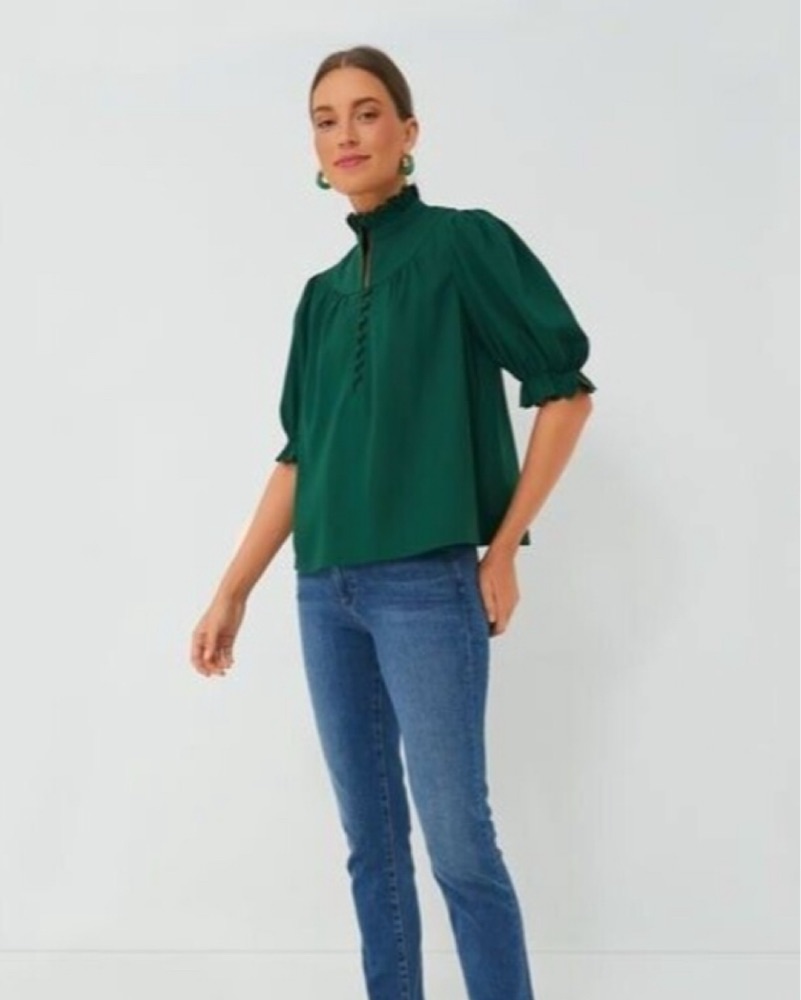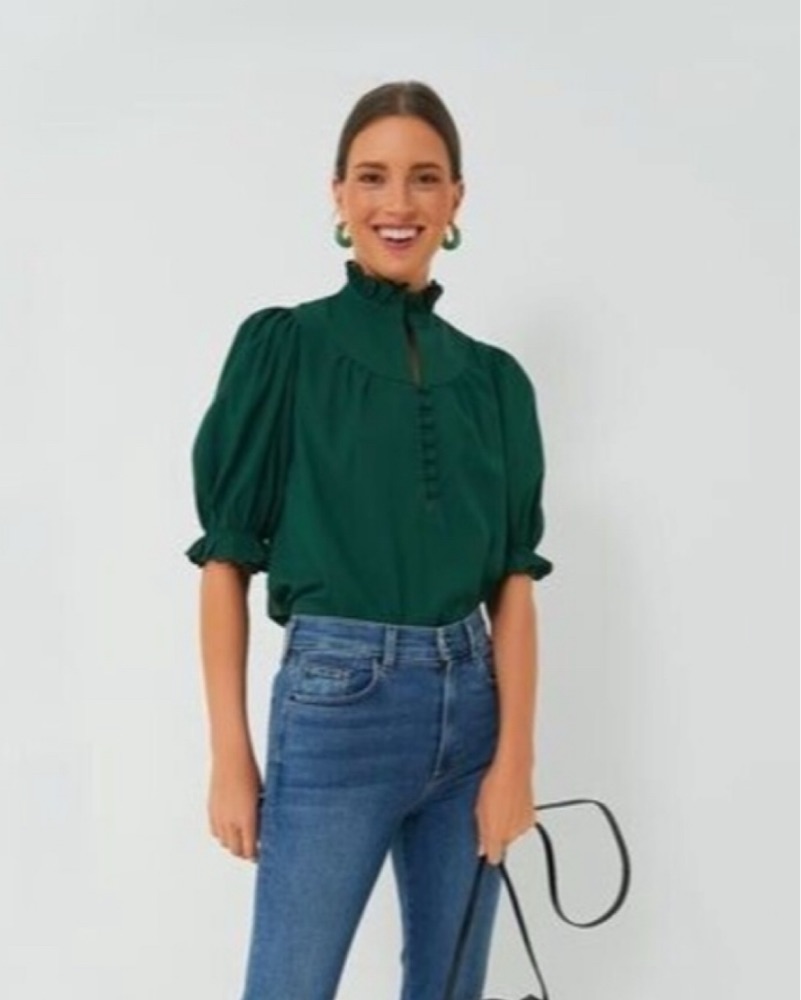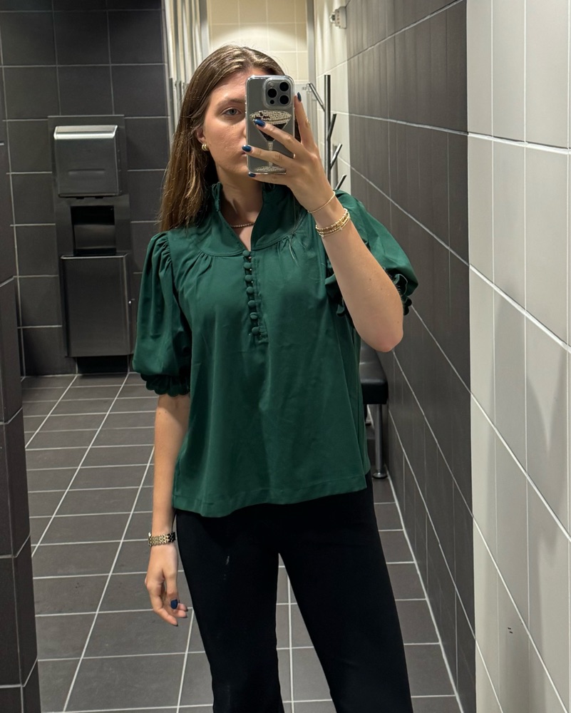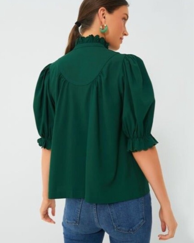 Hunter green preppy high neck button up blouse. Cute for work or brunch, very comfortable and loose. Perfect condition and only worn once