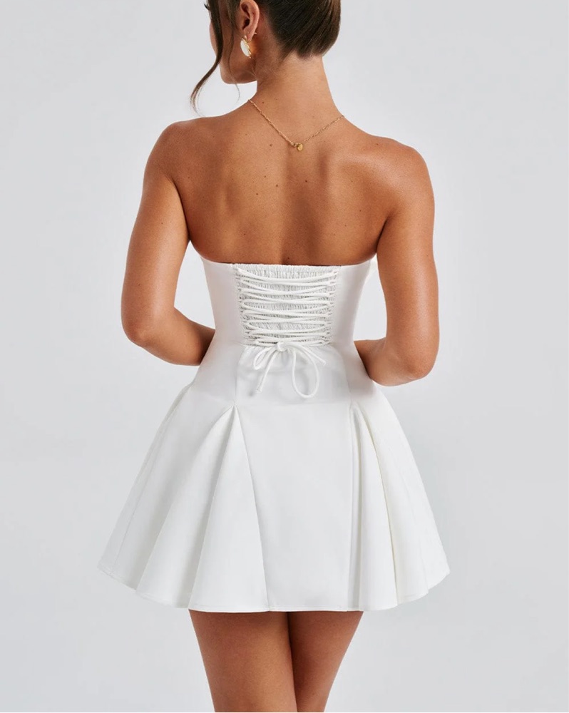Ruby is your perfect piece for any special occasion, featuring a flattering strapless neckline highlighted by an artful bow. A design bound to turn heads, this mini playsuit has built in shorts with a skirt overlay, plus lace up and shirred details to the back. Dress her up with the Perrie bow hair