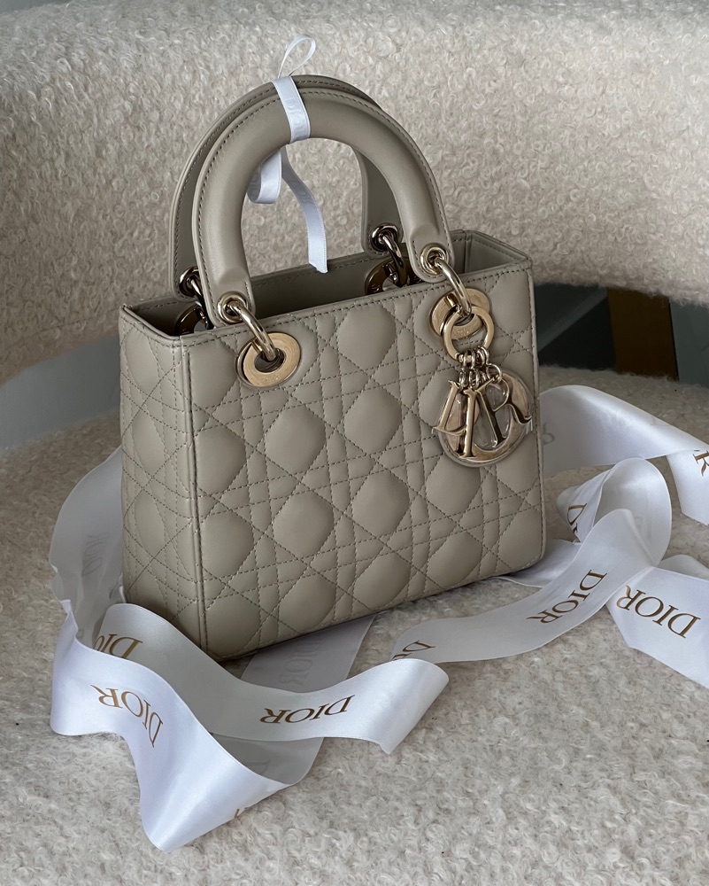 Small Lady Dior. Beautiful taupe grey “greige” color and white gold hardware. Comes with the removable long shoulder strap. Excellent condition. Please wear with care.