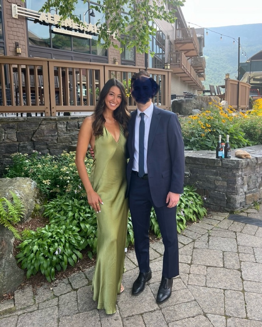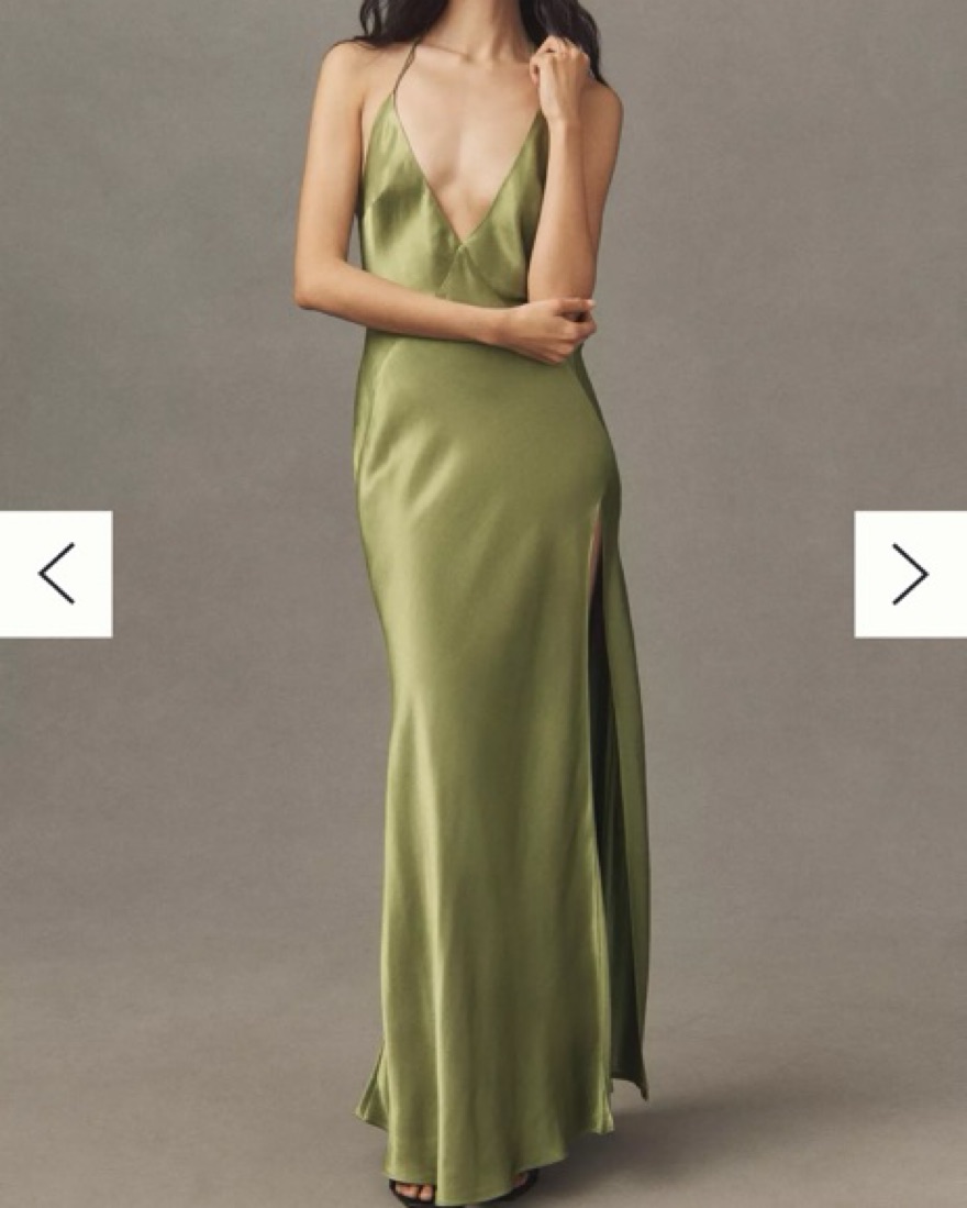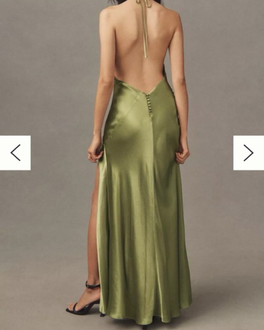 Color is “khaki” but its a brighter green in person. Dress is double lined so the fabric is more forgiving. Can adjust halter for higher or deeper V.