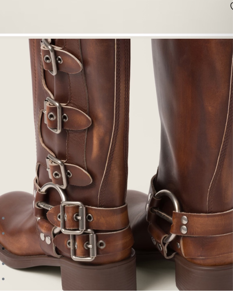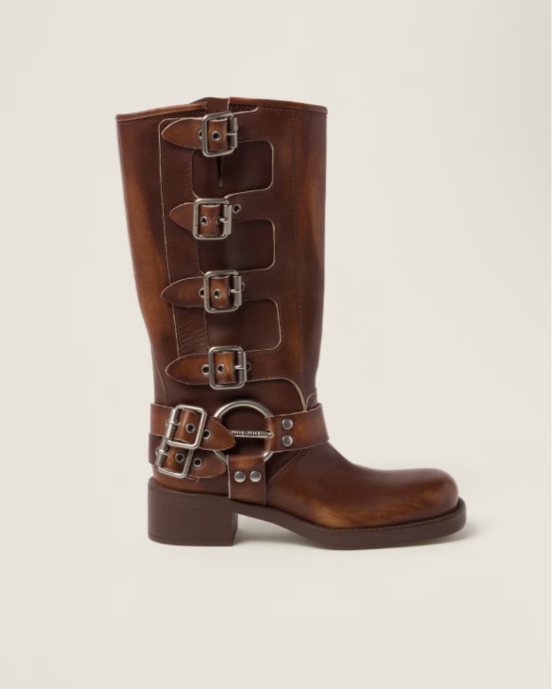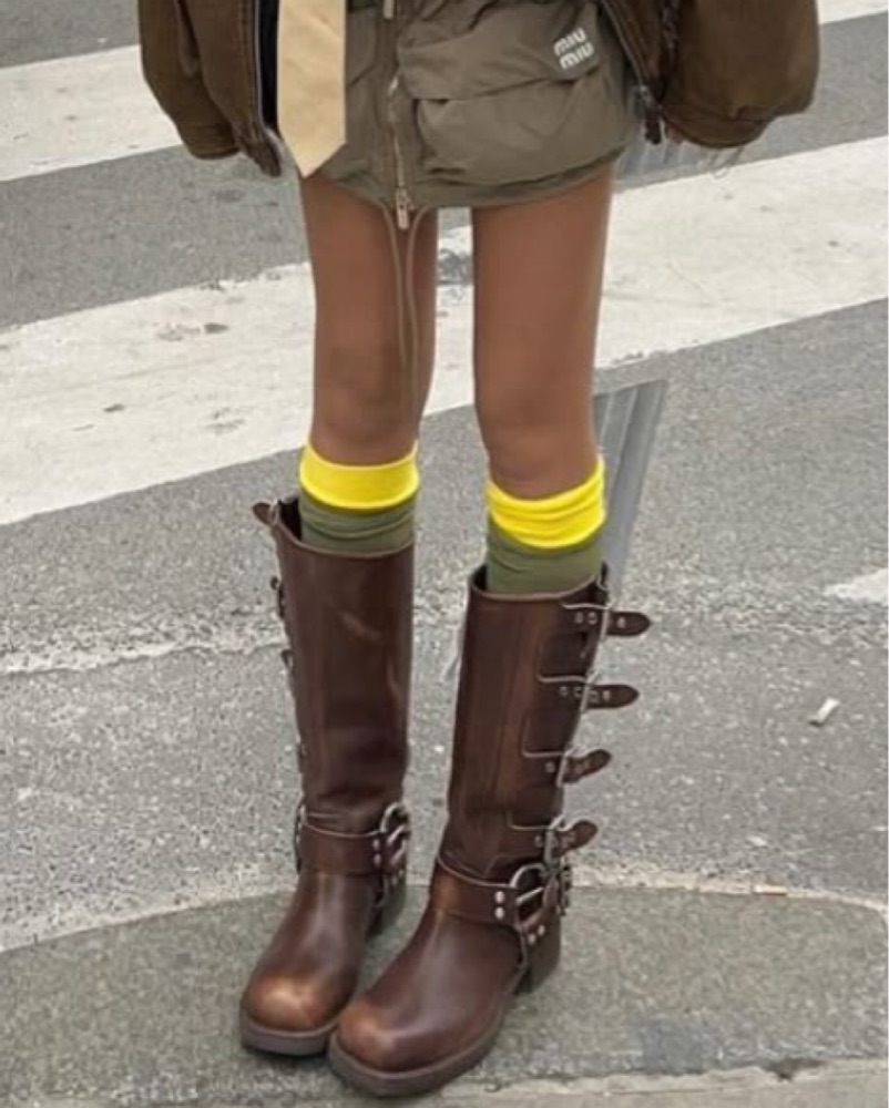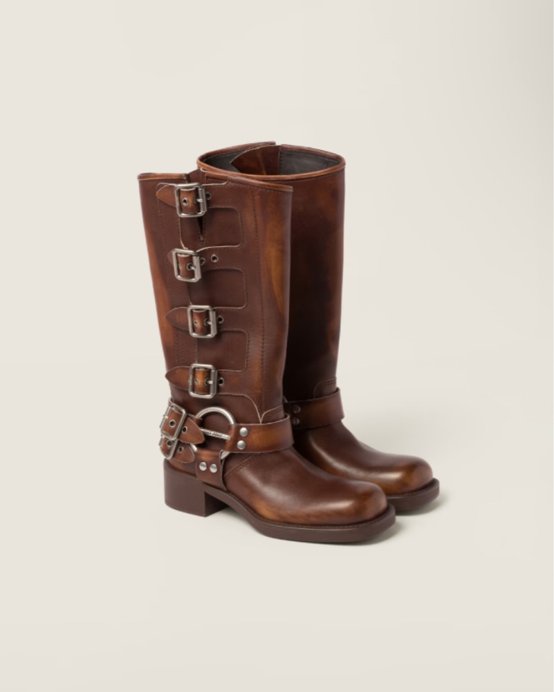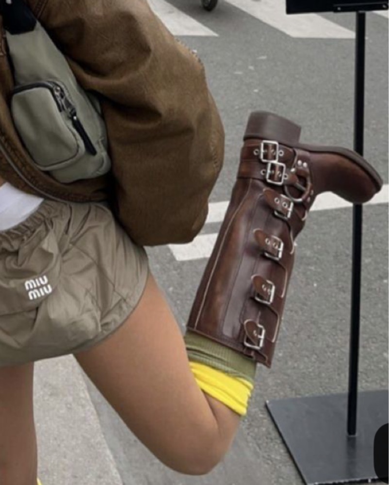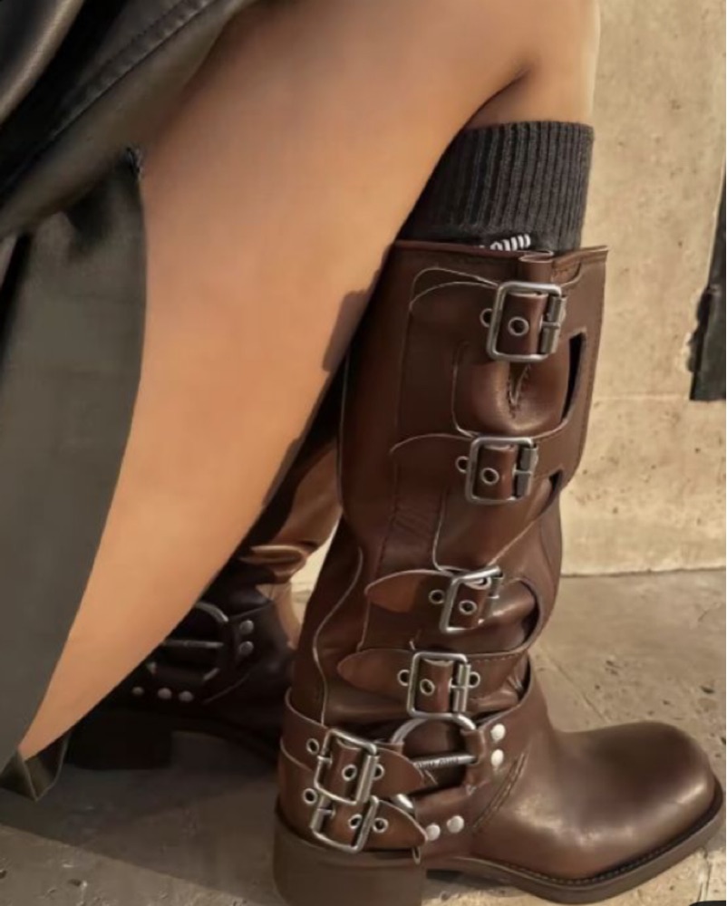 These edgy leather boots with multiple buckle details are perfect for adding a touch of edge to any outfit. Pair with a mini dress and moto jacket for a stylish casual look.