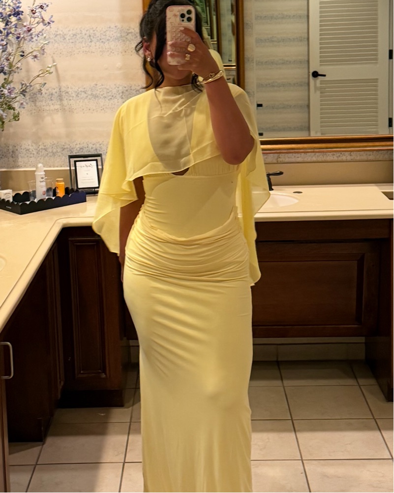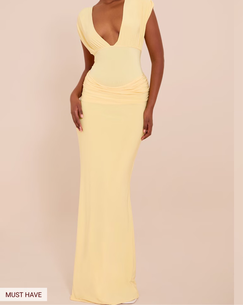 LEMON DOUBLE LAYER PLUNGE RUCHED SHOULDER DRAPE WAIST MAXI DRESS Channel sunshine vibes in the lemon double layer plunge ruched shoulder drape waist maxi dress. Featuring a plunge neckline, ruched shoulder and draped waist detail, this double-layer maxi dress is pure elegance. Sz 12 can fit a Sz 10