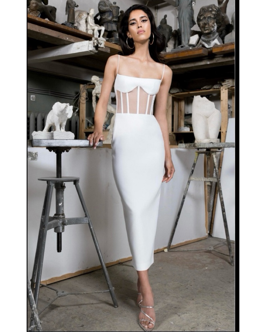 Sheer tule lines the boned bustier top; super chic for a wedding event!